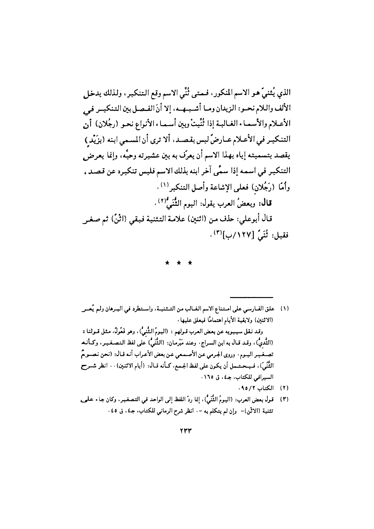 الذي يُثنّى هو الاسم المنكور، فمتى ثُنِّي الاسم وقع التنكير، ولذلك يدخل الألف واللام نحو: الزيدان وما أشبهه، إلا أنّ الفصل بين التنكير في الأعلام والأسماء الغالبة إذا ثُنِّيتْ وبين أسماء الأنواع نحو (رجلان) أن التنكير في الأعلام عارضٌ ليس بقصد، ألا ترى أن المسمى ابنه (بزَيْدٍ) يقصد بتسميته إياه بهذا الاسم أن يعرّف به بين عشيرته وحيِّه، وإنما يعرض التنكير في اسمه إذا سمّى آخر ابنه بذلك الاسم فليس تنكيره عن قصد، وأمّا (رجلان) فعلى الإشاعة وأصل التنكير.