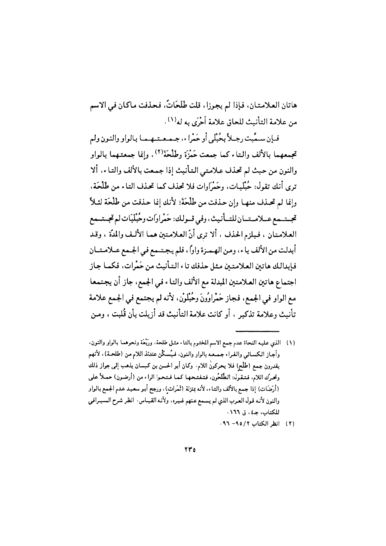 هاتان العلامتان، فإذا لم يجوزا، قلت طَلَحاتٌ، فحذفت ما كان في الاسم من علامة التأنيث للحاق علامة أحْرَى به له.