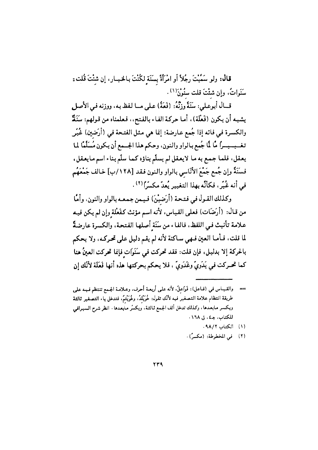 قال أبو علي: سَنَةٌ وزنُهُ: (فَعَةٌ) على ما لفظ به، ووزنه في الأصل يشبه أن يكون (فَعْلَة)، أما حركة الفاء بالفتح، فعلمناه من قولهم: سَنَةٌ والكسرة في فائه إذا جُمع عارضة؛ إنما هي مثل الفتحة في (أرَضين) غُيِّر تغييرًا لما جُمع بالواو والنون، وحكم هذا الجمع أن يكون مُسَلَّمًا لما يعقل، فلما جمع به ما لا يعقل لم يسلّم بناؤه كما سلّم بناء اسم ما يعقل، فسَنَةٌ وإن جُمع جَمْعَ الأناسِي بالواو والنون فقد خالف جَمْعَهم في أنه غُيّر، فكأنّه بهذا التغيير يُعدّ مكسّرًا.