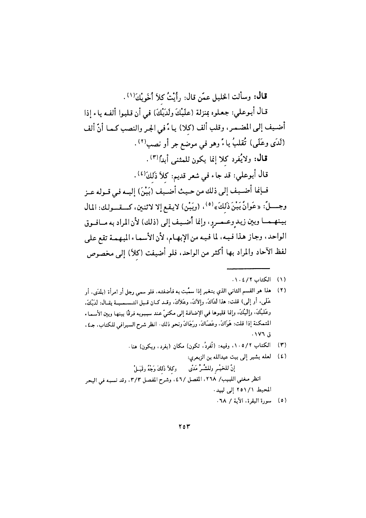 قال: وسألت الخليل عمّن قال: رأيتُ كِلا أخَوَيْكَ.