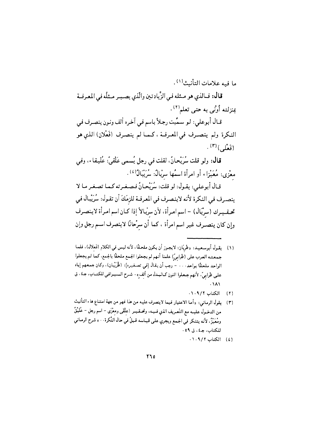 قال أبو علي: يقول: لو قلت: سُرَيْحانٌ فصغرته كما تصغر ما لا ينصرف في النكرة لأنه لا ينصرف في المعرفة للزِمَكَ أن تقول: سُرَيْبال في تحقيرك (سِرْبال) – اسم امرأة، لأن سِرْبالاً إذا كان اسم امرأة لا ينصرف وإن كان ينصرف غير اسم امرأة، كما أن سِرْحانًا لا ينصرف اسم رجل وإن