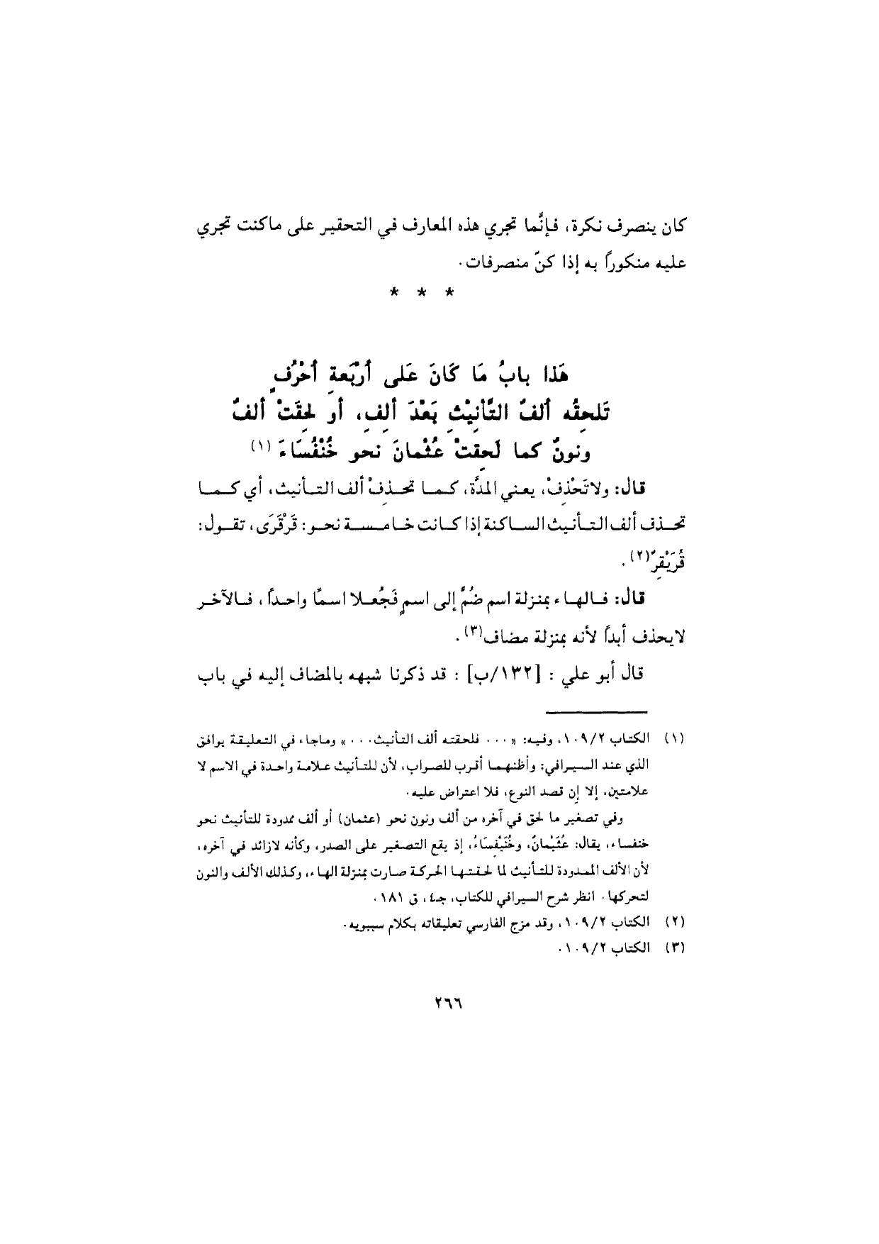 هذا بابُ ما كان على أربعة أحرف تلحقه ألف التأنيث بعد ألف، أو لحقت ألفٌ ونونٌ كما لحقت عُثمانَ نحو خُنْفُساءَ