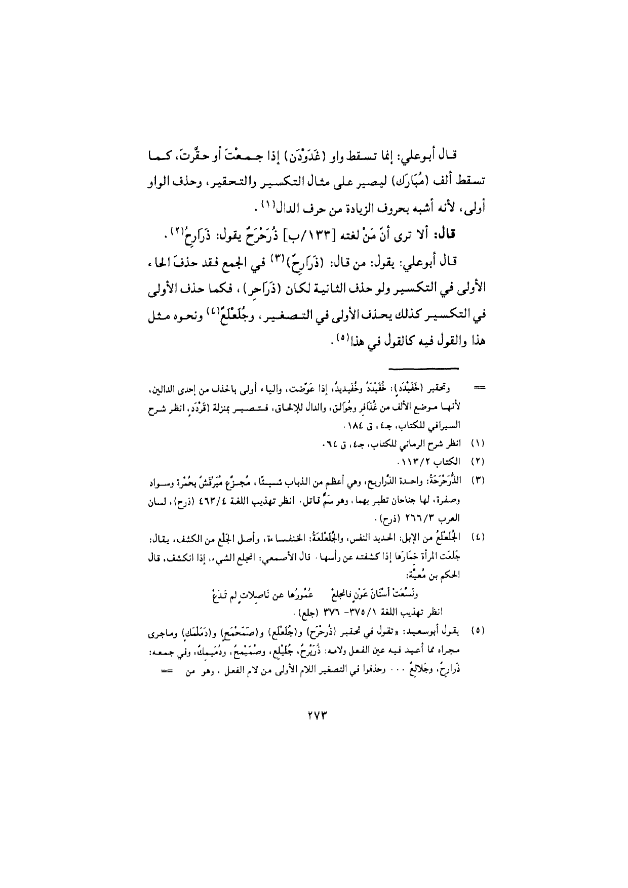 قال أبو علي: يقول: من قال: (ذَرارِحٌ) في الجمع فقد حذف الحاء الأولى في التكسير ولو حذف الثانية لكان (ذراحِر)، فكما حذف الأولى في التكسير كذلك يحذف الأولى في التصغير، وجُلَعْلَعٌ ونحوه مثل هذا والقول فيه كالقول في هذا.