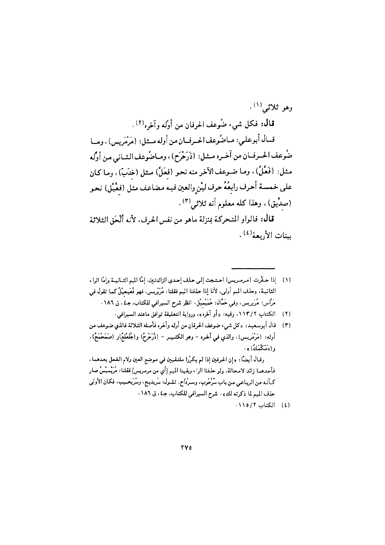 قال أبو علي: ما ضُوعف الحرفان من أوله مثل: (مَرْمريس)، وما ضُوعف الحرفان من آخره مثل: (ذَرَحْرَح)، وما ضوعف الثاني من أوّله مثل: (فَعَّلٌ)، وما ضوعف الآخر منه نحو (فِعَلّ) مثل (خِدَبّ)، وما كان على خمسة أحرف رابِعُهُ حرف لينٍ والعين فيه مضاعف مثل (فِعِّيل) نحو (صِدِّيق)، وهذا كله معلوم أنه ثلاثي.