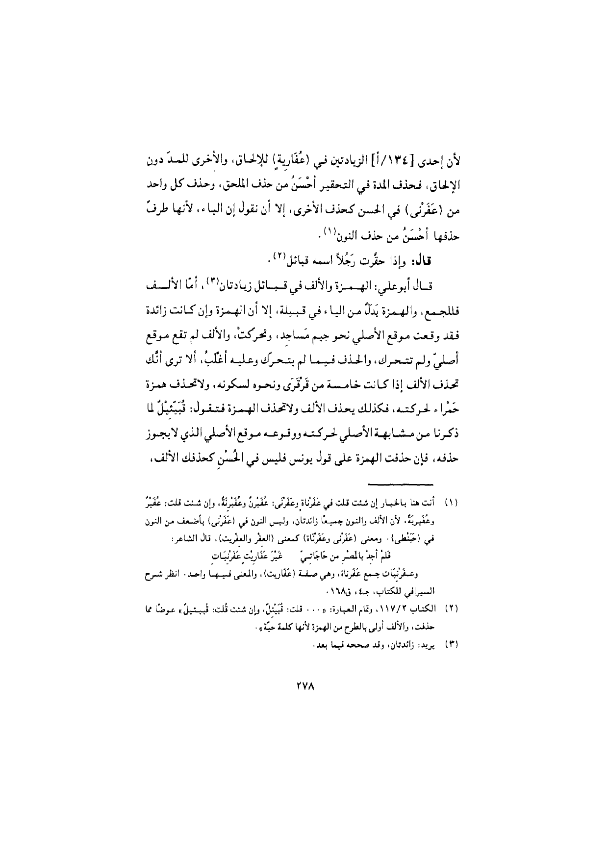 قال أبو علي: الهمزة والألف في قبائل زيادتان، أمّا الألف فللجمع، والهمزة بَدَلٌ من الياء في قبيلة، إلا أن الهمزة وإن كانت زائدة فقد وقعت موقع الأصلي نحو جيم مَساجِد، وتحركتْ، والألف لم تقع موقع أصليّ ولم تتحرك، والحذف فيما لم يتحرّك وعليه أغْلَبُ، ألا ترى أنّك تحذف الألف إذا كانت خامسة من قَرْقَرى ونحوه لسكونه، ولا تحذف همزة حَمراء لحركته، فكذلك يحذف الألف ولا تحذف الهمزة فتقول: قُبَيْئيلٌ لما ذكرنا من مشابهة الأصلي لحركته ووقوعه موقع الأصلي الذي لا يجوز حذفه، فإن حذفت الهمزة على قول يونس فليس في الحسن كحذفك الألف،
