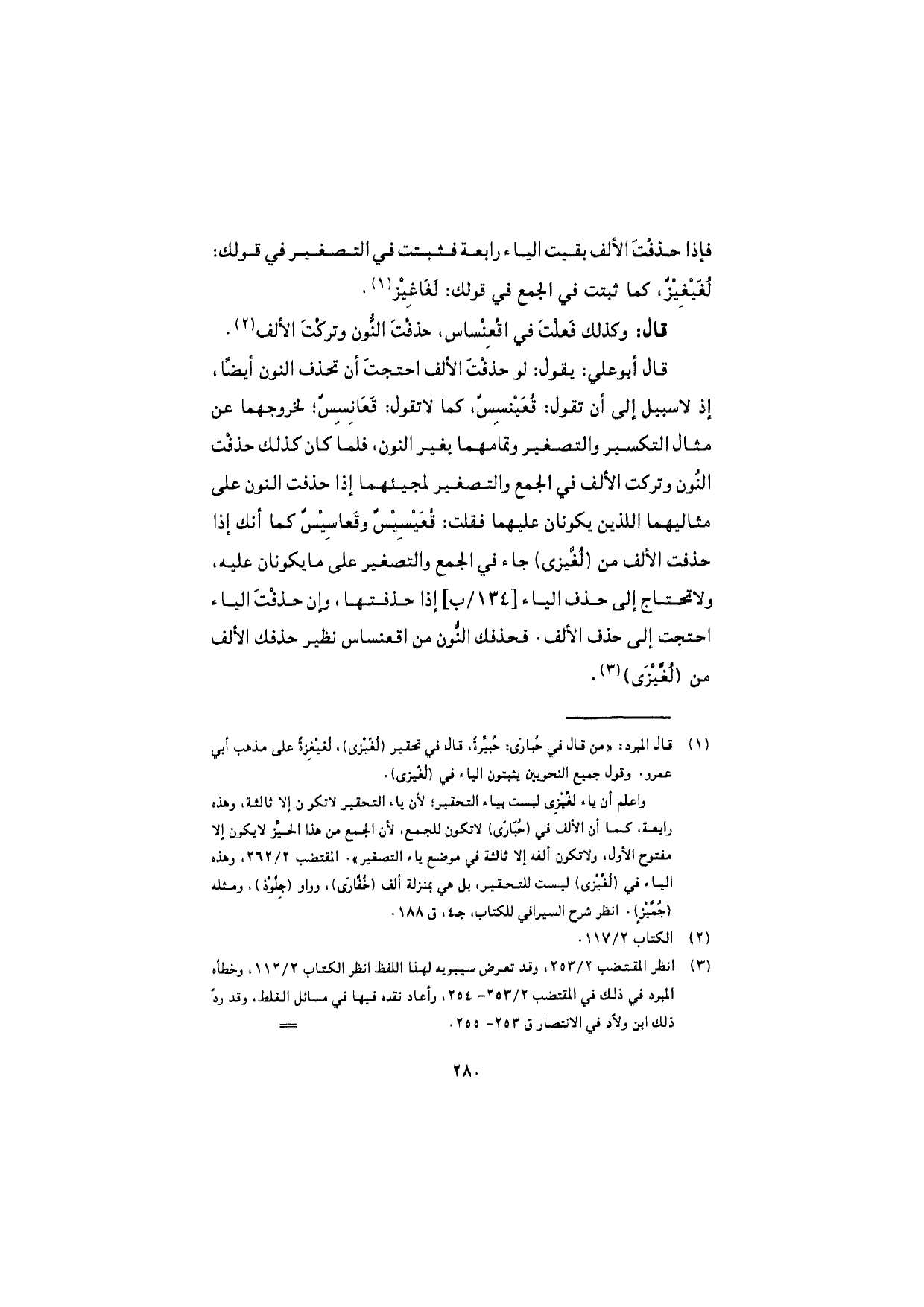قال أبو علي: يقول: لو حذفت الألف احتجتَ أن تحذف النون أيضًا، إذ لا سبيل إلى أن تقول: قُعَيْنسِسٌ، كما لا تقول: قَعانِسِسٌ، لخروجهما عن مثال التكسير والتصغير وتمامهما بغير النون، فلما كان كذلك حذفت النّون وتركت الألف في الجمع والتصغير لمجيئهما إذا حذفت النون على مثاليهما اللذين يكونان عليهما فقلت: قُعَيْسِيسٌ وقَعاسِيسٌ كما أنك إذا حذفت الألف من (لُغَّيزى) جاء في الجمع والتصغير على ما يكونان عليه، ولا تحتاج إلى حذف الياء إذا حذفتها، وإن حذفت الياء احتجت إلى حذف الألف. فحذفك النّون من اقعنساس نظير حذفك الألف من (لُغَّيْزَى).
