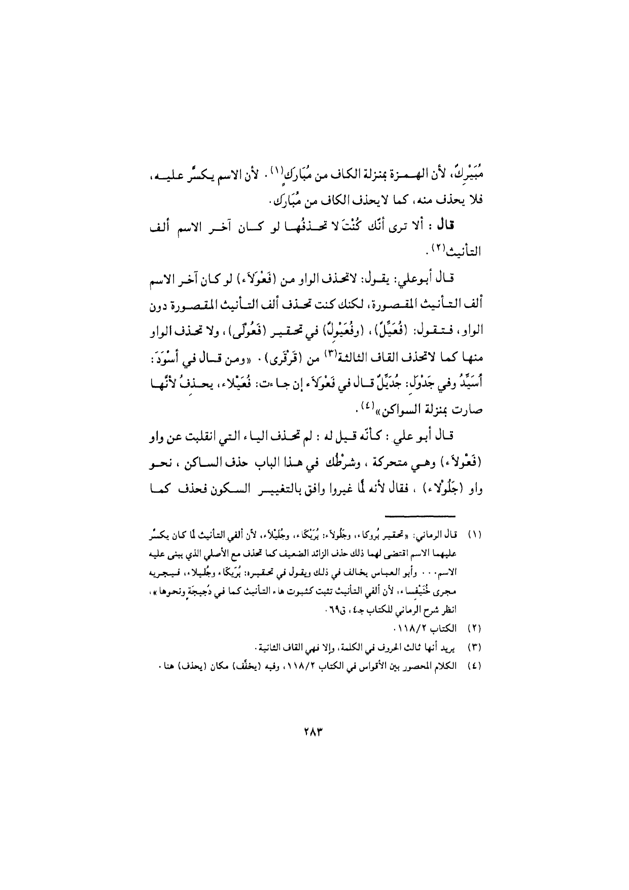 قال: ألا ترى أنّك كنت لا تحذفها لو كان آخر الاسم ألف التأنيث.