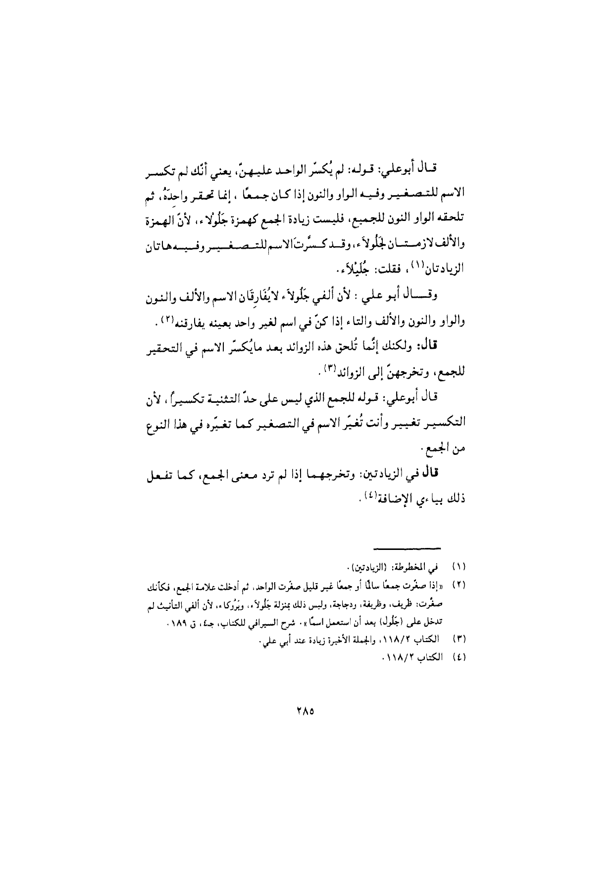 قال ابو علي: قوله: لم يُكسّر الواحد عليهنّ، يعني أنّك لم تكسر الاسم للتصغير وفيه الواو والنون إذا كان جمعًا، إنما تحقر واحِدَه، ثم تلحقه الواو والنون للجميع، فليست زيادة الجمع كهمزة جَلولاء، لأنّ الهمزة والألف لازمتان لجَلولاء، وقد كسّرت الاسم للتصغير وفيه هاتان الزيادتان، فقلت: جُلَيْلاء.