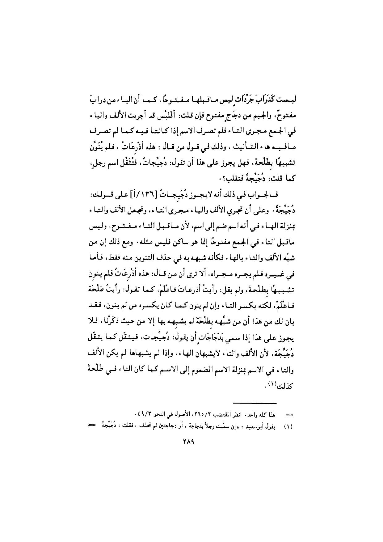 فالجواب في ذلك أنه لا يجوز دُجَيجاتٌ على قولك: دُجَيِّجَةٌ. وعلى أن تجري الألف والياء مجرى التاء، وتجعل الألف والتاء بمنزلة الهاء في أنه اسم ضم إلى اسم، لأن ما قبل التاء مفتوح، وليس ما قبل التاء في الجمع مفتوحًا إنما هو ساكن فليس مثله. ومع ذلك إن من شبّه الألف والتاء بالهاء فأنه شبهه به في حذف التنوين منه فقط، فأما في غيره فلم يجر مجراه، ألا ترى أن من قال: هذه أذْرِعاتٌ فلم ينوِن تشبيهًا بطلحةَ، ولم يقل: رأيتُ أذرعاتَ فاعلمْ، كما تقول: رأيتُ طلحة فاعلم، لكنه يكسر التاء وإن لم ينون كما كان يكسره من لم ينون، فقد بان لك من هذا أن من شبَّهه بطلحةَ لم يشبهه بها إلا من حيث ذكرنا، فلا يجوز على هذا إذا سمي بدَجاجاتٍ أن يقول: دُجيِّجات، فيثقّل كما يثقّل دُجَيِّجة، لأن الألف والتاء لا يشبهان الهاء، وإذا لم يشبهاها لم يكن الألف والتاء في الاسم بمنزلة الاسم المضموم إلى الاسم كما كان التاء في طلحة كذلك.