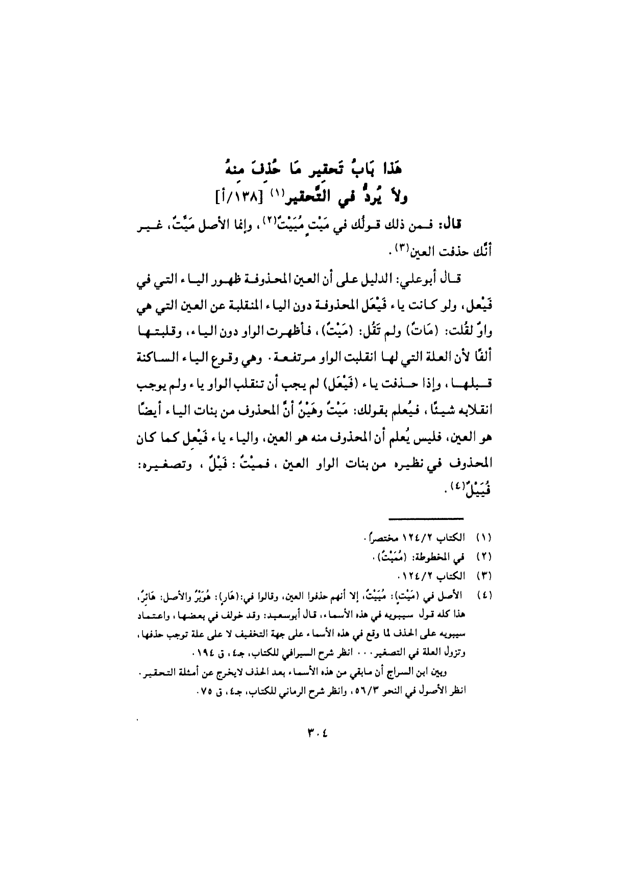 قال أبو علي: الدليل على أن العين المحذوفة ظهور الياء التي في فَيْعل، ولو كانت ياء فَيْعَل المحذوفة دون الياء المنقلبة عن العين التي هي واوٌ لقلت: (ماتٌ) ولم تقل (مَيْتٌ)، فأظهرت الواو دون الياء، وقلبتها ألفًا لأن العلة التي لها انقلبت الواو مرتفعة، وهي وقوع الياء الساكنة قبلها، وإذا حذفت ياء (فَيْعَل) لم يجب أن تنقلب الواو ياء ولم يوجب انقلابه شيئًا، فيُعلم بقولك: مَيْتٌ وهَيْنٌ أنّ المحذوف من بنات الياء أيضًا هو العين، فليس يُعلم أن المحذوف منه هو العين، والياء ياء فَيْعِل كما كان المحذوف في نظيره من بنات الواو العين، فميْتٌ: فَيْلٌ، وتصغيره: فُيَيْلٌ.