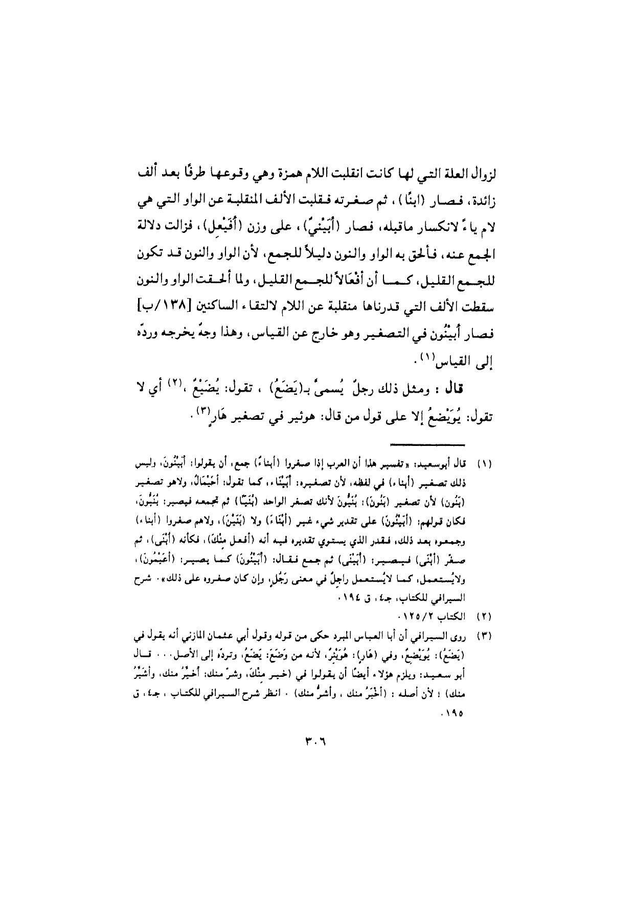 قال: ومثل ذلك رجلٌ يُسمّى بـ (يَضَعُ)، تقول: يُضَيْعٌ، أي لا تقول: يُوَيْضعُ إلا على قول من قال: هوئير في تصغير هارٍ.