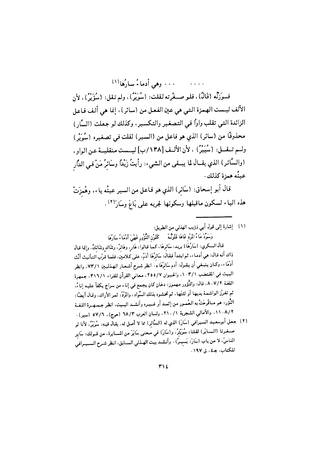 فوزنه (فالٌ)، فلو صغّرته لقلت: (سُوَيْرٌ)، ولم تقل: (سُؤَيْرٌ)، لأن الألف ليست الهمزة التي هي عين الفعل من (سائر)، إنما هي ألف فاعل الزائدة التي تقلب واوًا في التصغير والتكسير، وكذلك لو جعلت (السّار) محذوفًا من (سائر) الذي هو فاعل من (السير) لقلت في تصغيره (سُوَيْر) ولم تقل: (سُيَيْرٌ)، لأن الألف ليست منقلبة عن الواو، (والسّائر) الذي يقال لما يبقى من الشيء: رأيتُ زيدًا وسائرُ من في الدار عينُه همزة كذلك.
