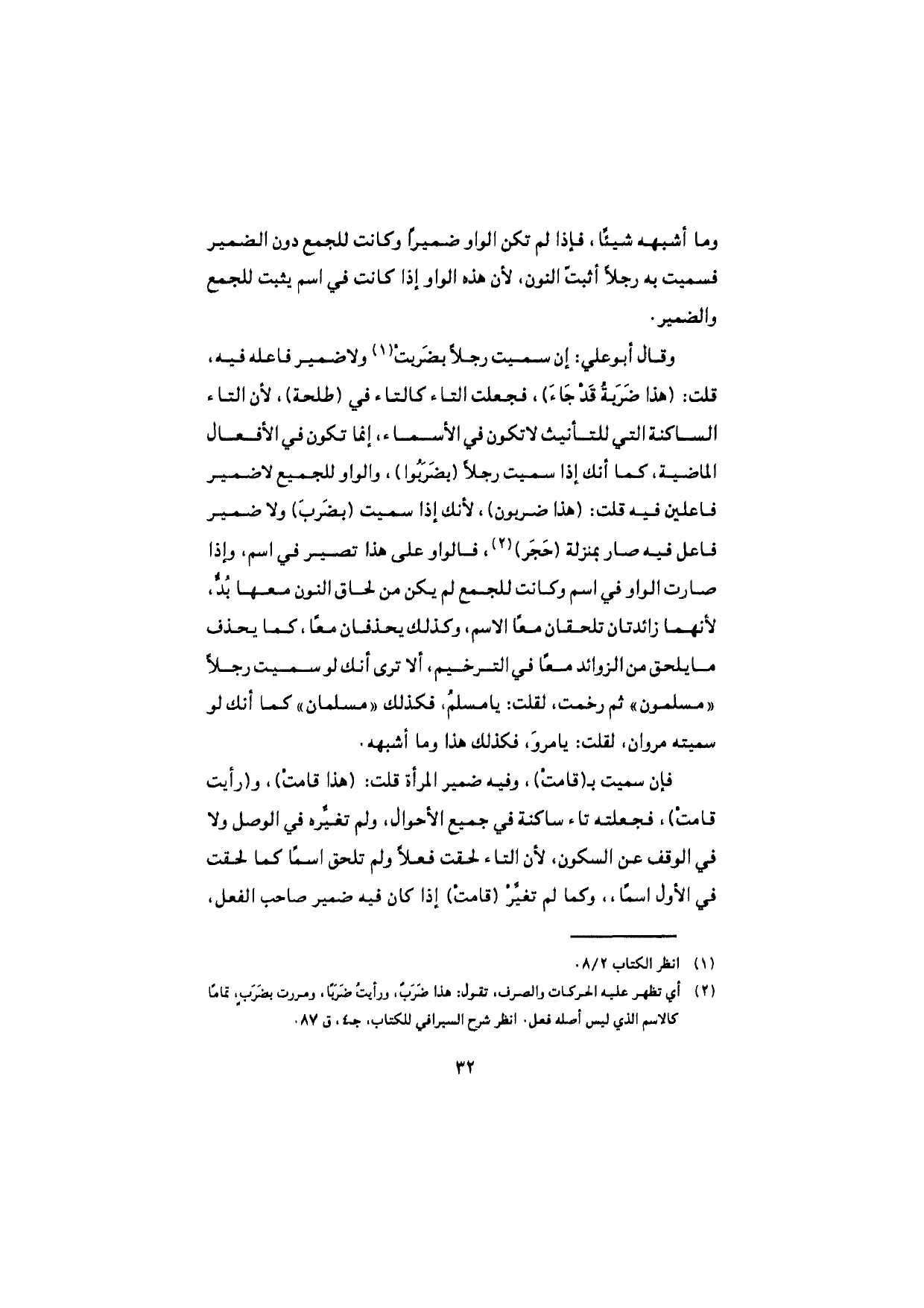 وقال أبو علي: إن سميت رجلاً بضربتْ ولا ضمير فاعله فيه، قلت: (هذا ضَرَبَةُ قد جاء)، فجعلت التاء كالتاء في (طلحة)، لأن التاء الساكنة التي للتأنيث لا تكون في الأسماء، إنما تكون في الأفعال الماضية، كما أنك إذا سميت رجلاً (بضَرَبُوا)، والواو للجميع لا ضمير فاعلين فيه قلت: (هذا ضربون)، لأنك إذا سميت (بضَرَبَ) ولا ضمير فاعل فيه صار بمنزلة (حَجَر)، فالواو على هذا تصير في اسم، وإذا صارت الواو في اسم وكانت للجمع لم يكن من لحاق النون معها بُدٌّ، لأنهما زائدتان تلحقان معًا الاسم، وكذلك يحذفان معًا، كما يحذف ما يلحق من الزوائد معًا في الترخيم، ألا ترى أنك لو سميت رجلاً "مسلمون" ثم رخمت، لقلت: يا مسلمُ، فكذلك "مسلمان" كما أنك لو سميته مروا، لقلت: يا مروَ، فكذلك هذا وما أشبهه.