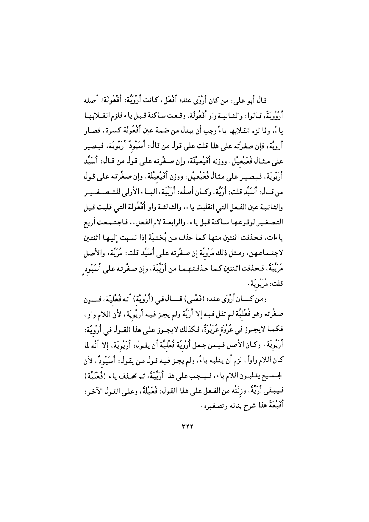ومن كان أرْوَى عنده (فَعْلى) قال في (أرْويَّة) أنه فُعْلِيّة، فإن صغَّرته وهو فُعْلِيَّة لم تقل فيه إلا أريَّة ولم يجز فيه أريوِيَة، لأن اللام واو، فكما لا يجوز في عُرْوَةٍ عُرَيْوَةٌ، فكذلك لا يجوز على هذا القول في أرْوِيّة: أرَيْوِيَة. وكان الأصل فيمن جعل أرْويّة فُعْلِيَّة أن يقول: أرَيْوِيَة، إلا أنّه لما كان اللام واوًا، لزم أن يقلبه ياءً، ولم يجز فيه قول من يقول: أسَيْوِدٌ، لأن الجميع يقلبون اللام ياء، فيجب على هذا أرَيِّيَةٌ، ثم تحذف ياء (فُعْلَيَّة) فيبقى أرَيَّةٌ، وزِنَتُه من الفعل على هذا القول: فُعَيْلَةٌ، وعلى القول الآخر: أفَيْعَةٌ هذا شرح بنائه وتصغيره.