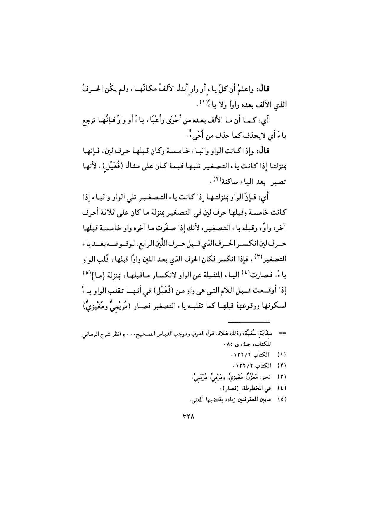 قال: وإذا كانت الواو والياء خامسة وكان قبلها حرف لين، فإنها بمنزلتها إذا كانت ياء التصغير تليها فيما كان على مثال (فُعَيْلٍ)، لأنها تصير بعد الياء ساكنة.