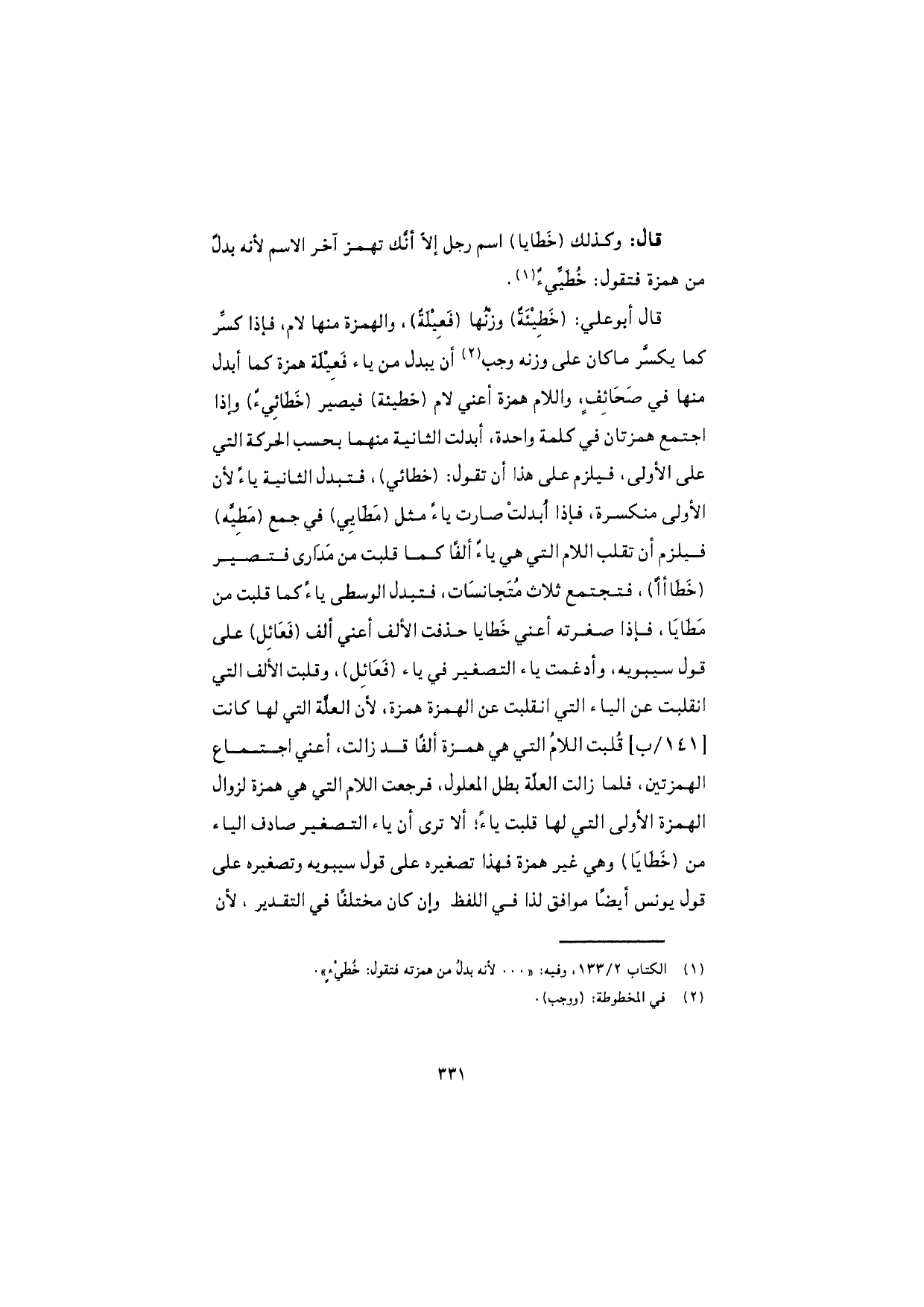 قال ابو علي: (خَطِيئَةٌ) وزنُها (فَعِيلةٌ)، والهمزة منها لام، فإذا كسِّر كما يكسِّر ما كان على وزنه وجب أن يبدل من ياء فعيلة همزة كما أبدل منها في صحائِف، واللام همزة أعني لام (خطيئة) فيصير (خَطائِيءٌ) وإذا اجتمع همزتان في كلمة واحدة، أبدلت الثانية منهما بحسب الحركة التي على الأولى، فيلزم على هذا أن تقول: (خطائي)، فتبدل الثانية ياءً لأن الأولى منكسرة، فإذا أبدلتْ صارت ياءً مثل (مَطايِي) في جمع (مَطِيَّة) فيلزم أن تقلب اللام التي هي ياءٌ ألفًا كما قلبت من مَدارى فتصير (خَطاأأ)، فتجتمع ثلاث متجانسات، فتبدل الوسطى ياءً كما قلبت من مَطايا، فإذا صغرته أعني خطايا حذفت الألف أعني ألف (فَعائِل) على قول سيبويه، وأدغمت ياء التصغير في ياء (فعائِل)، وقلبت الألف التي انقلبت عن الياء التي انقلبت عن الهمزة همزة، لأن العلّة التي لها كانت قُلبت اللامُ التي هي همزة ألفًا قد زالت، أعني اجتماع الهمزتين، فلما زالت العلّة بطل المعلول، فرجعت اللام التي هي همزة لزوال الهمزة الأولى التي لها قلبت ياءً؛ ألا ترى أن ياء التصغير صادف الياء من (خَطايا) وهي غير همزة فهذا تصغيره على قول سيبويه وتصغيره على قول يونس أيضًا موافق لذا في اللفظ وإن كان مختلفًا في التقدير، لأن