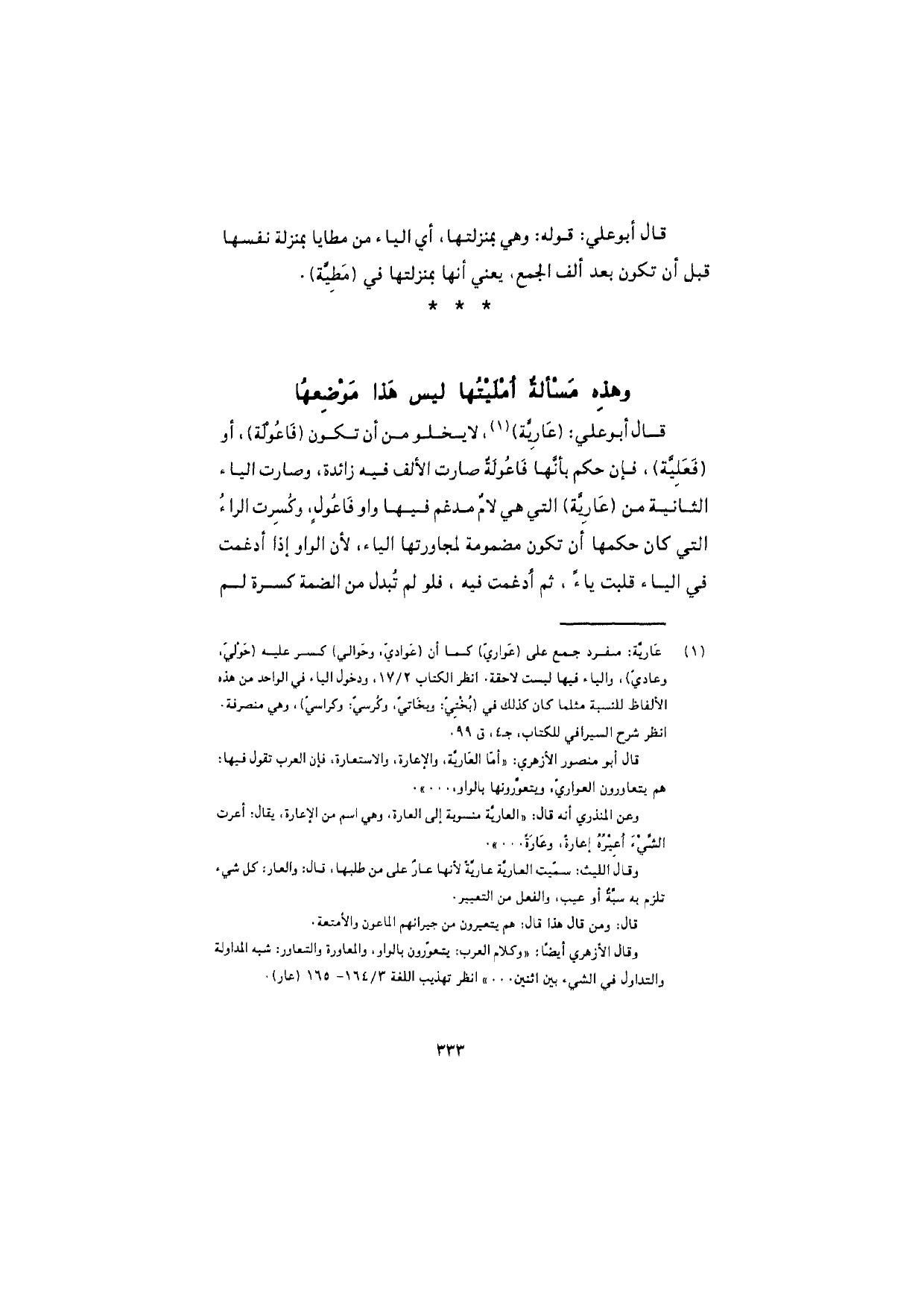 قال أبو علي: (عارِيَّة)، لا يخلو من أن تكون (فاعُولَة)، أو (فَعَلِيَّة)، فإن حكم بأنّها فاعُولَةٌ صارت الألف فيه زائدة، وصارت الياء الثانية من (عارِيَّة) التي هي لامٌ مدغم فيها واو فاعُولٍ، وكُسِرت الراءُ التي كان حكمها أن تكون مضمومة لمجاورتها الياء، لأن الواو إذا أدغمت في الياء قلبت ياءً، ثم أدغمت فيه، فلو لم تُبدل من الضمة كسرة لم