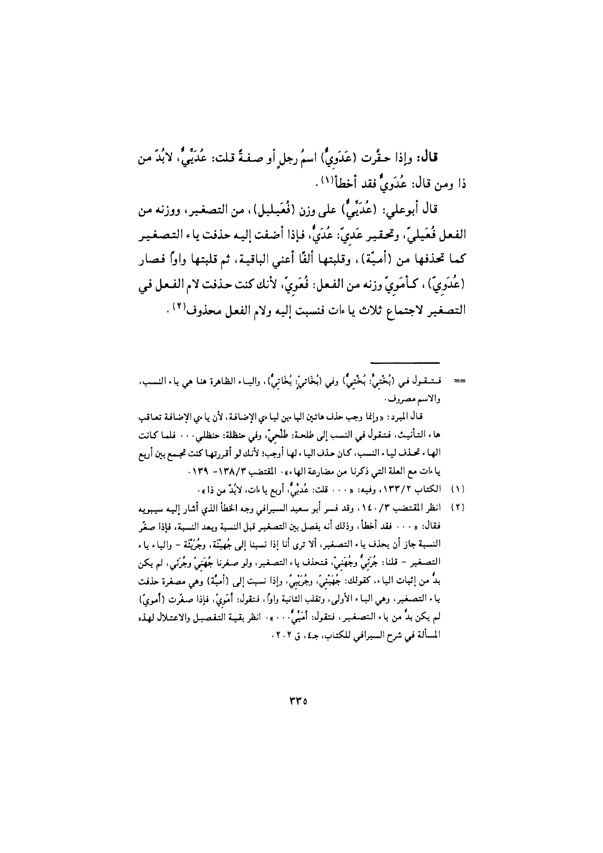 قال: وإذا حقَّرت (عَدَوِيٌّ) اسمُ رجلٍ أو صفة قلت: عُدَيِّيٌّ، لا بد من ذا ومن قال: عُدَويٌّ فقد أخطأ.