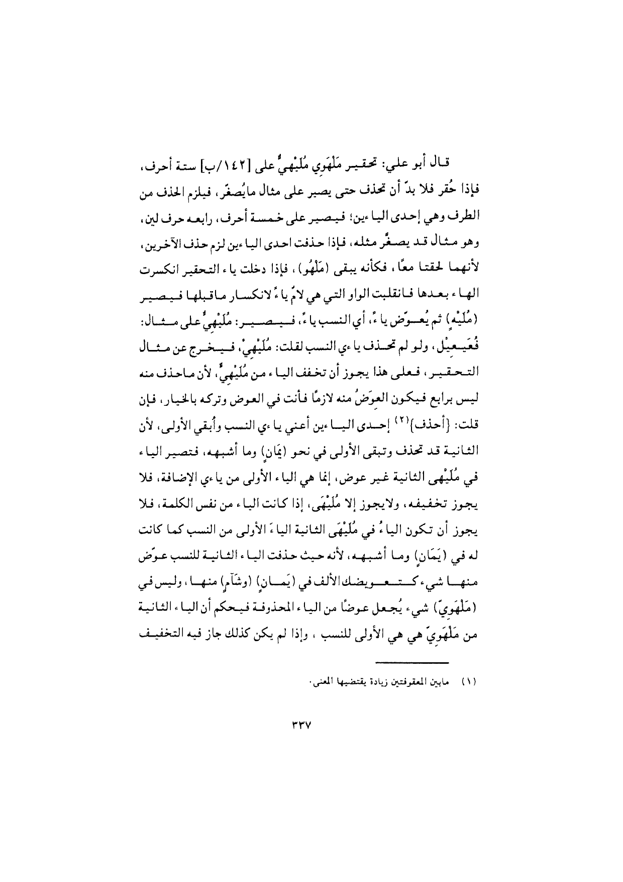 قال أبو علي: تحقير مَلْهَوِي مُلَيْهيٌّ على ستة أحرف، فإذا حُقر فلا بدّ أن تحذف حتى يصير على مثال ما يُصغّر، فيلزم الحذف من الطرف وهي إحدى الياءين، فيصير على خمسة أحرف، رابعه حرف لين. وهو مثال قد يصغَّر مثله، فإذا حذفت إحدى الياءين لزم حذف الآخرين، لأنهما لحقتا معًا، فكأنه يبقى (مَلْهُو)، فإذا دخلت ياء التحقير انكسرت الهاء بعدها فانقلبت الواو التي هي لامٌ ياءً لانكسار ما قبلها فيصير (مُلَيْهٍ) ثم يُعوّض ياءً، أي النسب ياءً، فيصير: مُلَيْهِيٌّ على مثال: فُعَيعِيل، ولو لم تحذف ياءي النسب لقلت: مُلَيْهِي، فيخرج عن مثال التحقير، فعلى هذا يجوز أن تخفف الياء من مُلَيْهِيّ، لأن ما حذف منه ليس برابع فيكون العِوَضُ منه لازمًا فأنت في العوض وتركه بالخياء، فإن قلت: {أحذف} إحدى الياءين أعني ياءي النسب وأبقي الأولى، لأن الثانية قد تحذف وتبقى الأولى في نحو (يَمانٍ) وما أشبهه، فتصير الياء في مُلَيْهى الثانية غير عوض، إنما هي الياء الأولى من ياءي الإضافة، فلا يجوز تخفيفه، ولا يجوز إلا مُلَيْهَى، إذا كانت الياء من نفس الكلمة، فلا يجوز أن تكون الياءُ في مُلَيْهى الثانية الياءَ الأولى من النسب كما كانت له في (يَمانٍ) وما أشبهه، لأنه حيث حذفت الياء الثاني للنسب عوّض منها شيء كتعويضك الألف في (يَمانٍ) (وشَآمٍ) منها، وليس في (مَلْهَوِيّ) شيء يُجعل عوضًا من الياء المحذوفة فيحكم أن الياء الثانية من مَلْهَوِيّ هي هي الأولى للنسب، وإذا لم يكن كذلك جاز فيه التخفيف