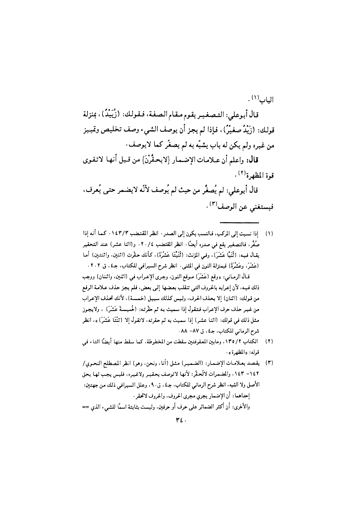 قال أبو علي: التصغير يقوم مقام الصفة، فقولك: (زُيَيْدٌ)، بمنزلة قولك: (زيدٌ صغيرٌ)، فإذا لم يجز أن يوصف الشيء وصف تخليص وتمييز من غيره ولم يكن له باب يشبّه به لم يصغّر كما لا يوصف.