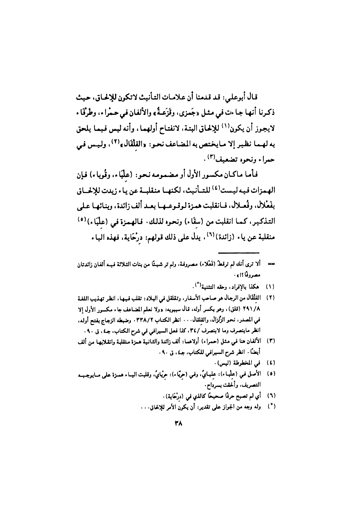 قال أبو علي: قد قدمنا أن علامات التأنيث لا تكون للإلحاق، حيث ذكرنا أنها جاءت في مثل "جَمزى، وقَزَعةٌ" والألفان في حمْراء، وطرْفاء لا يجوز أن يكون للإلحاق البتة، لانفتاح أولهما، وأنه ليس فيما يلحق به لهما نظير إلا ما يختص به المضاعف نحو: "القِلْقال"، وليس في حمراء ونحوه تضعيف.
