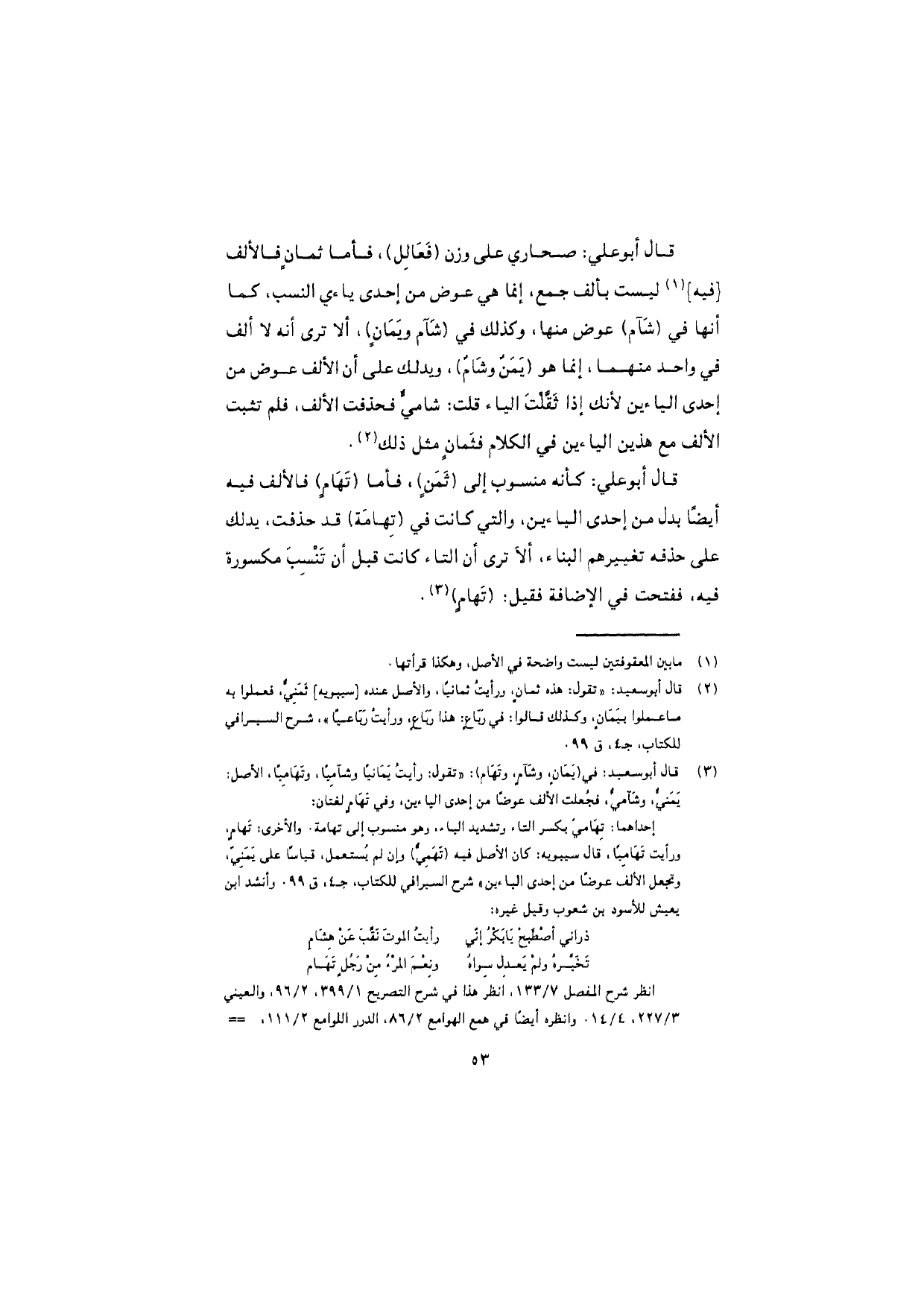 قال أبو علي: كأنه منسوب إلى (ثَمَنٍ)، فأما (تَهامٍ) فالألف فيه أيضًا بدل من إحدى الياءين، والتي كانت في (تِهامَة) قد حذفت، يدلك على حذفه تغييرهم البناء، ألا ترى أن التاء كانت قبل أن تَنْسِبَ مكسورة فيه، ففتحت في الإضافة فقيل: (تَهامٍ).