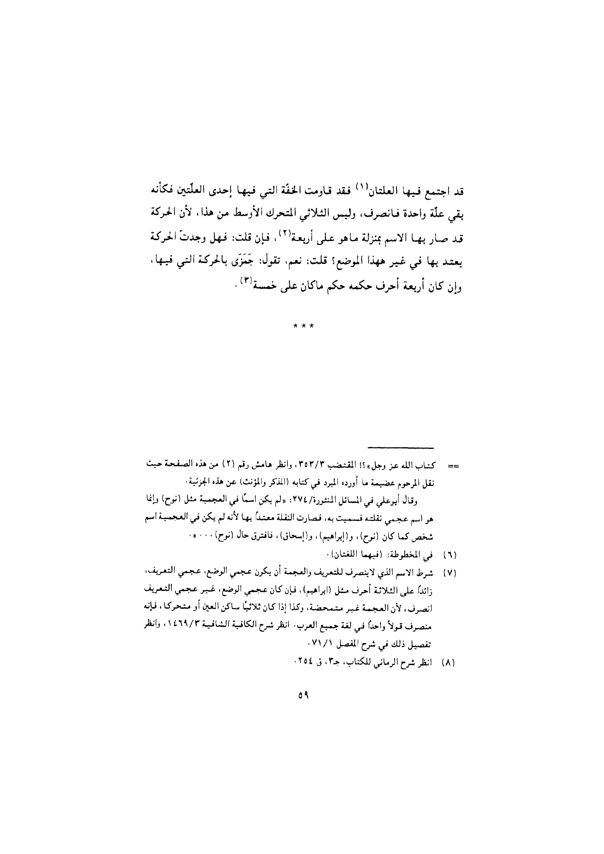قد اجتمع فيها العلتان فقد قاومت الخفّة التي فيها إحدى العلّتين فكأنّه بقي علّة واحدة فانصرف، وليس الثلاثي المتحرك الأوسط من هذا، لأن الحركة قد صار بها الاسم بمنزلة ما هو على أربعة، فإن قلت: فهل وجدت الحركة يعتد بها في غير هذا الموضع؟ قلت: نعم، تقول: جَمَزَى بالحركة التي فيها، وإن كان أربعة أحرف حكمه حكم ما كان على خمسة.
