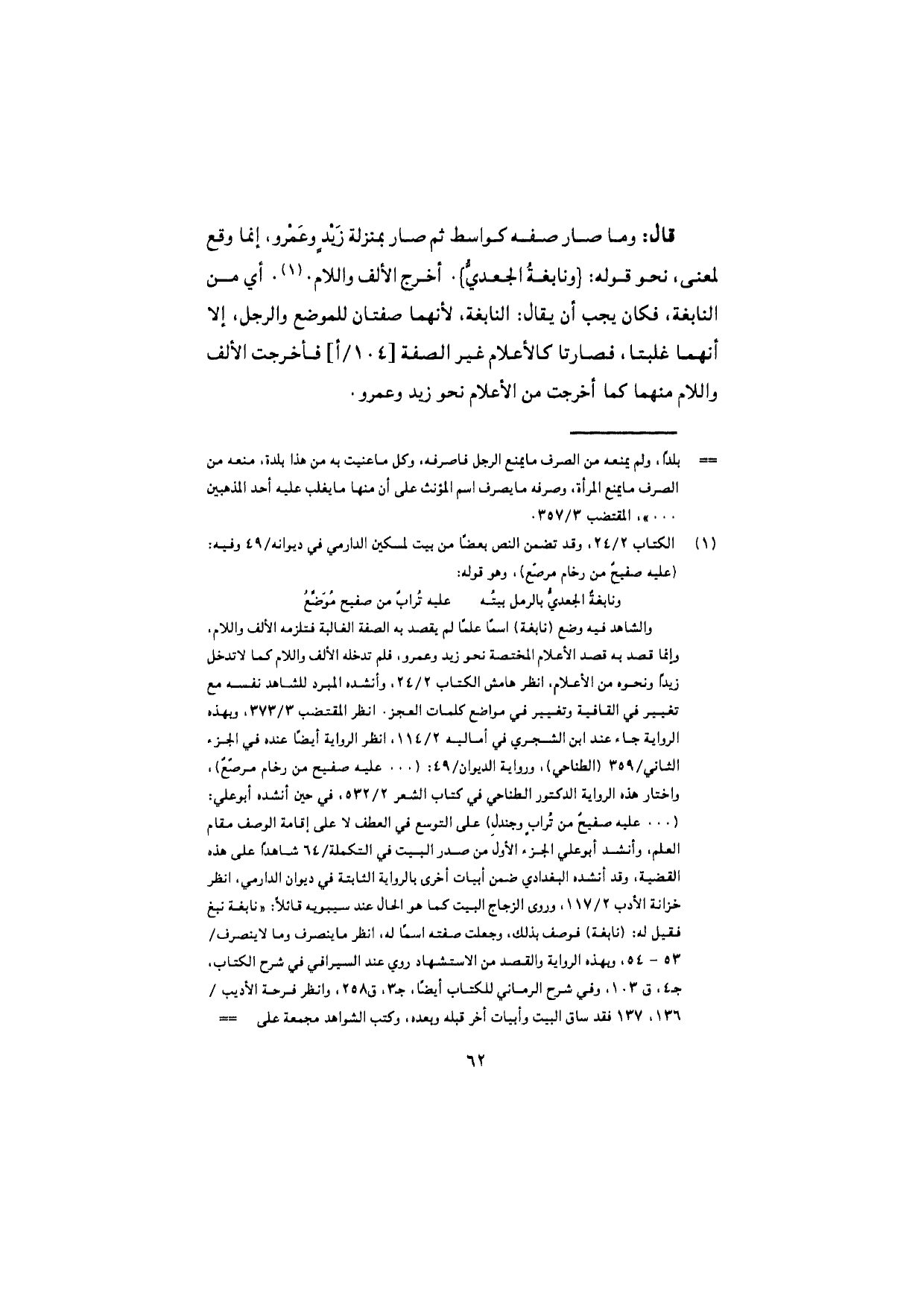 قال: وما صار صفه كواسط ثم صار بمنزلة زيدٍ وعَمْرو، إنما وقع لمعنى، نحو قوله: {ونابغةُ الجعديُّ}. أخرج الألف واللام. أي من النابغة، فكان يجب أن يقال: النابغة، لأنهما صفتان للموضع والرجل، إلا أنهما غلبتا، فصارتا كالأعلام غير الصفة فأخرجت الألف واللام منهما كما أخرجت من الأعلام نحو زيد وعمرو.