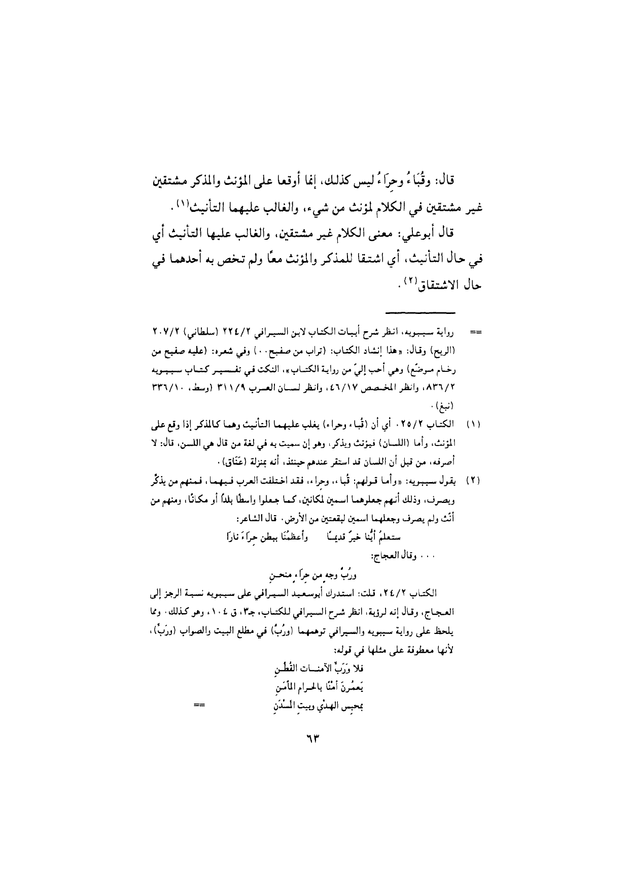 قال: وقُباءُ وحِراءُ ليس كذلك، إنما أوقعا على المؤنث والمذكر مشتقين غير مشتقين في الكلام لمؤنث من شيء، والغالب عليهما التأنيث.