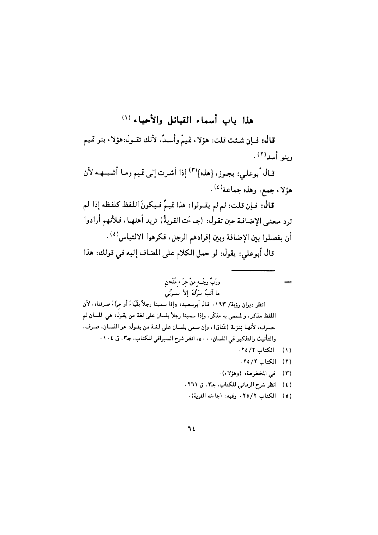 قال أبو علي: يجوز، {هذه} إذا أشرت إلى تميم وما أشبهه لأن هؤلاء جمع، وهذه جماعة.