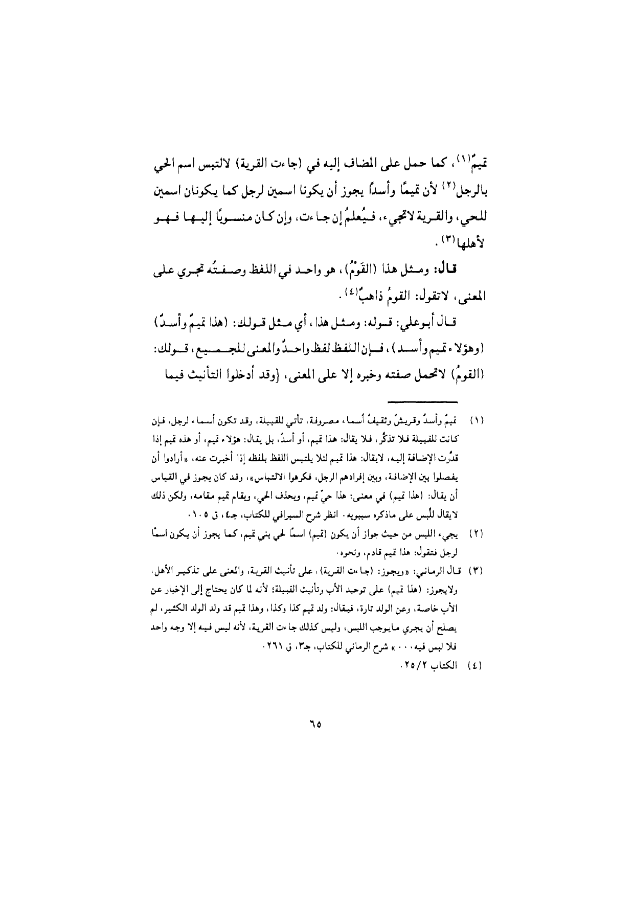 تميمٌ، كما حمل على المضاف إليه في (جاءت القرية) لالتبس اسم الحي بالرجل لأن تميمًا وأسدًا يجوز أن يكونا اسمين لرجل كما يكونان اسمين للحي، والقرية لا تجيء، فيُعلمُ إن جاءت، وإن كان منسوبًا إليها فهو لأهلها.
