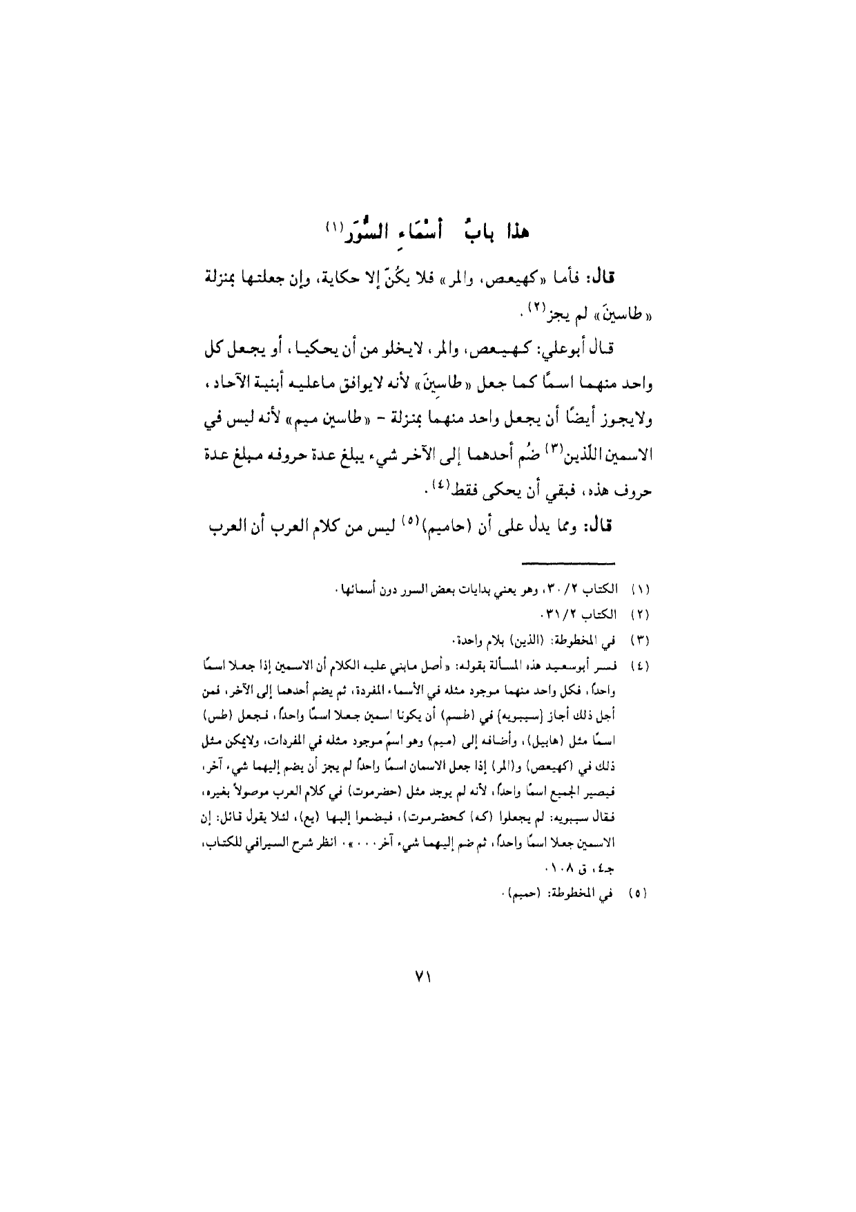 قال: فأما "كهيعص، والمر" فلا يكُنّ إلا حكاية، وإن جعلتها بمنزلة "طاسينَ" لم يجز.