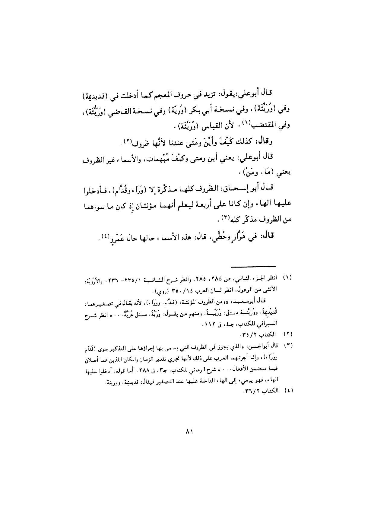 قال أبو علي: يقول: تزيد في حروف المعجم كما أدخلت في (قديديمة) وفي (وُرَيِّئَة)، وفي نسخة أبي بكر (وُريّة) وفي نسخة القاضي (وَرَيُّئَة)، وفي المقتضب، لأن القياس (ورَيّئة).