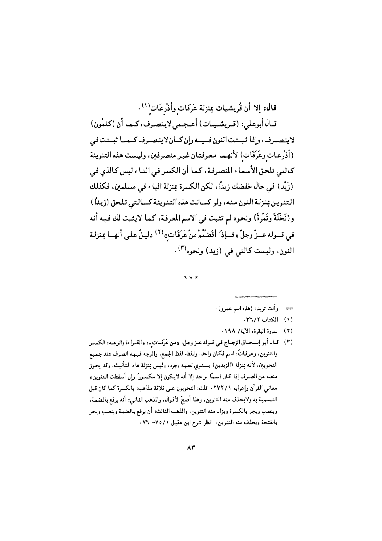 قال أبو علي: (قريشيات) أعجمي لا ينصرف، كما أن (كلمُون) لا ينصرف، وإنما ثبتت النون فيه وإن كان لا ينصرف كما ثبتت في (أذْرعاتٍ وعَرَفاتٍ) لأنهما معرفتان غير منصرفين، وليست هذه التنوينة كالتي تلحق الأسماء المنصرفة، كما أن الكسر في التاء ليس كالذي في (زَيد) في حال خفضك زيدًا، لكن الكسرة بمنزلة الياء في مسلمين، فكذلك التنوين بمنزلة النون منه، ولو كانت هذه التنوينه كالتي تلحق (زيدًا) و (نَخْلَةً وتَمْرةً) ونحوه لم تثبت في الاسم المعرفة، كما لا يثبت لك فيه أنه في قوله عزّ وجلّ "فإذا أفَضْتُم من عرفاتٍ" دليلٌ على أنها بمنزلة النون، وليست كالتي في (زيد) ونحوه.