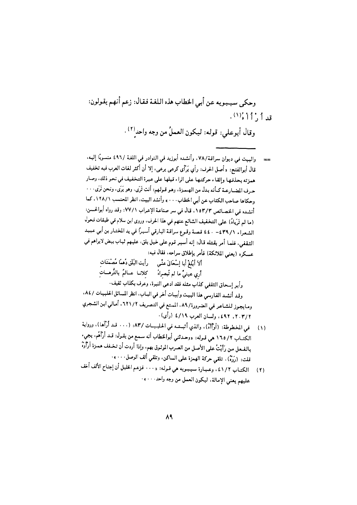 وحكى سيبويه عن أبي الخطاب هذه اللغة فقال: زعم أنهم يقولون: قد أرْأاهُ.