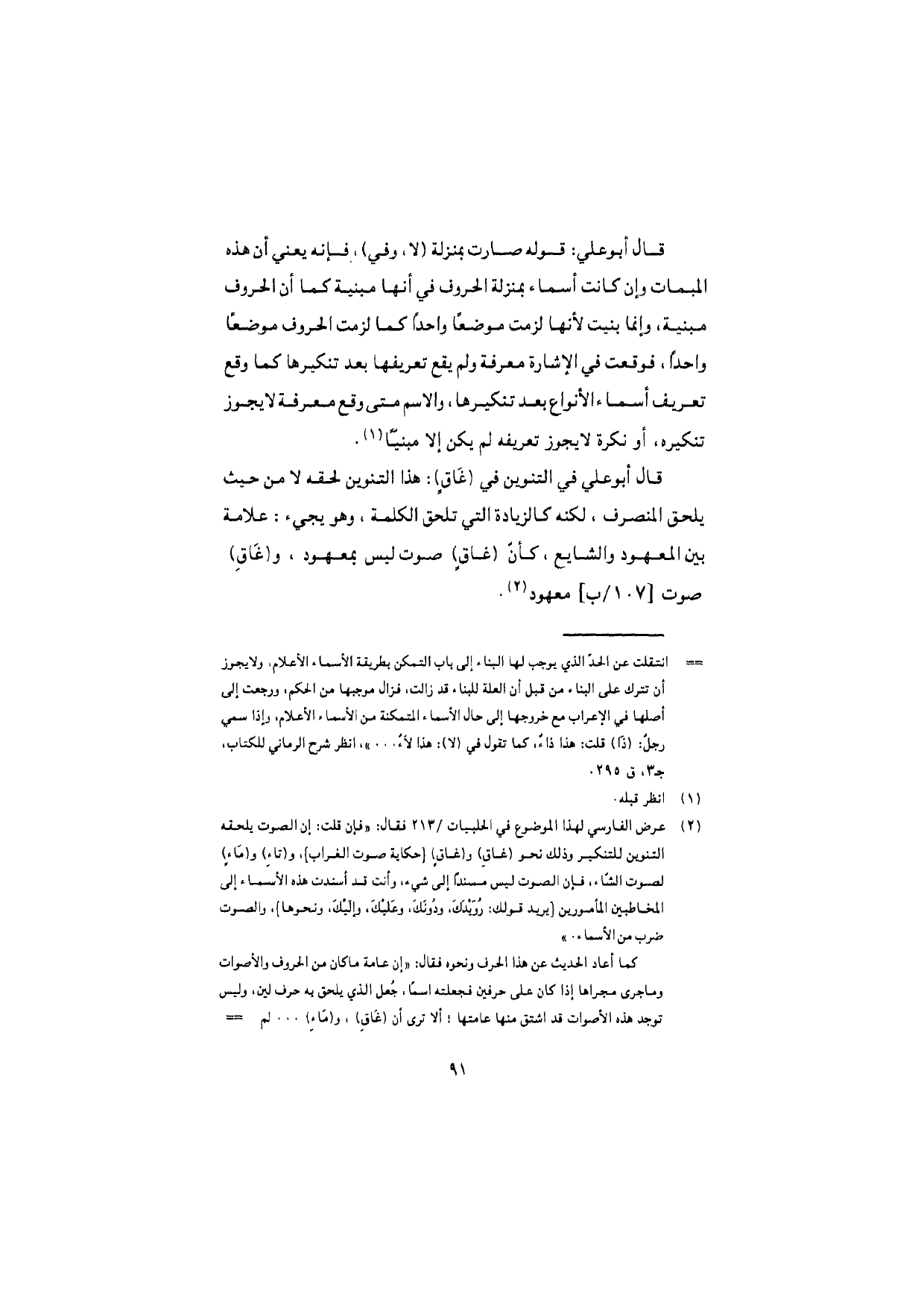 قال أبو علي في التنوين في (غاقٍ): هذا التنوين لحقه لا من حيث يلحق المنصرف، لكنه كالزيادة التي تلحق الكلمة، وهو يجيء: علامة بين المعهود والشايع، كأنّ (غاقٍ) صوت ليس بمعهود، و (غاقِ) صوت معهود.