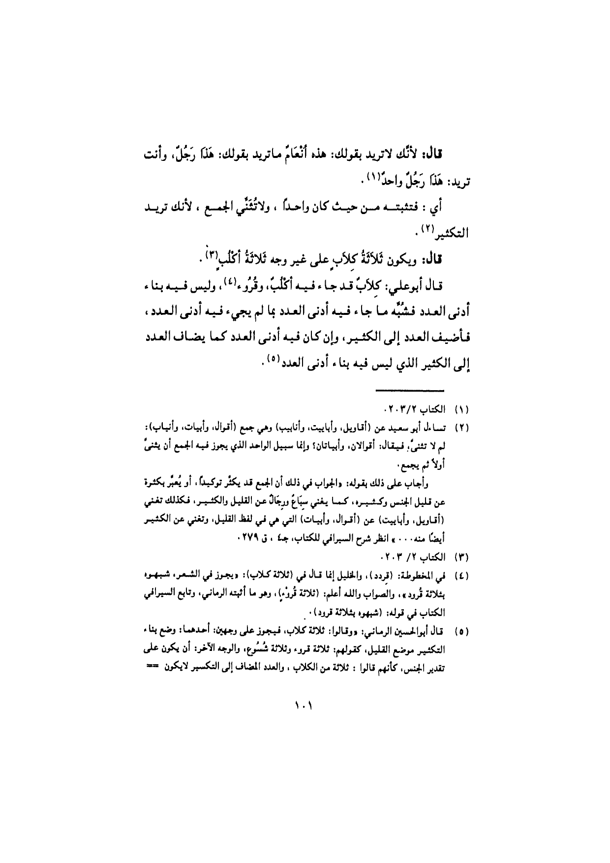 قال أبو علي: كِلابٌ قد جاء فيه أكْلُبٌ، وقُروء، وليس فيه بناء أدنى العدد فشُبِّه ما جاء فيه أدنى العدد بما لم يجئ فيه أدنى العدد، فأضيف العدد إلى الكثير، وإن كان فيه أدنى العدد كما يضاف العدد إلى الكثير الذي ليس فيه بناء أدنى العدد.