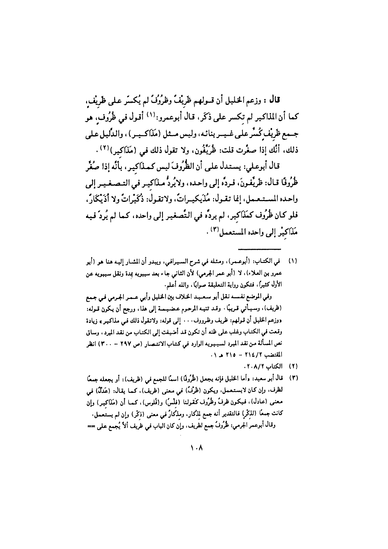 قال: وزعم الخليل أن قولهم ظَريفٌ وظُرُوفٌ لم يُكسّر على ظَريفٍ، كما أن المذاكير لم تكسر على ذكر، قال أبو عمرو: أقول في ظُروفٍ، هو جمع ظَريفٍ كُسِّر على غير بنائه، وليس مثل (مَذاكِير)، والدّليل على ذلك، أنّك إذا صغَّرت قلت: ظُرَيِّفُون، ولا تقول ذلك في (مَذاكِير).