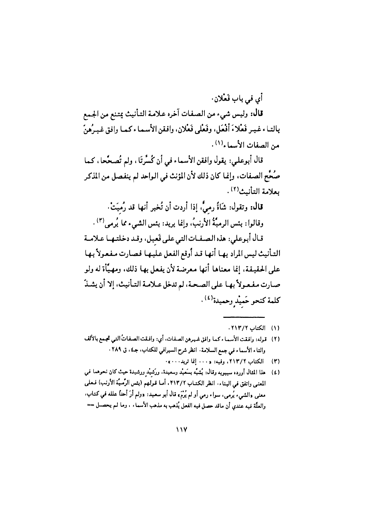 قال: وليس شيء من الصفات آخره علامة التأنيث يمتنع من الجمع بالتاء غير فَعْلاء أفْعَل، وفَعْلى فَعْلان، وافقن الأسماء كما وافق غيرُهنّ من الصفات الأسماء.