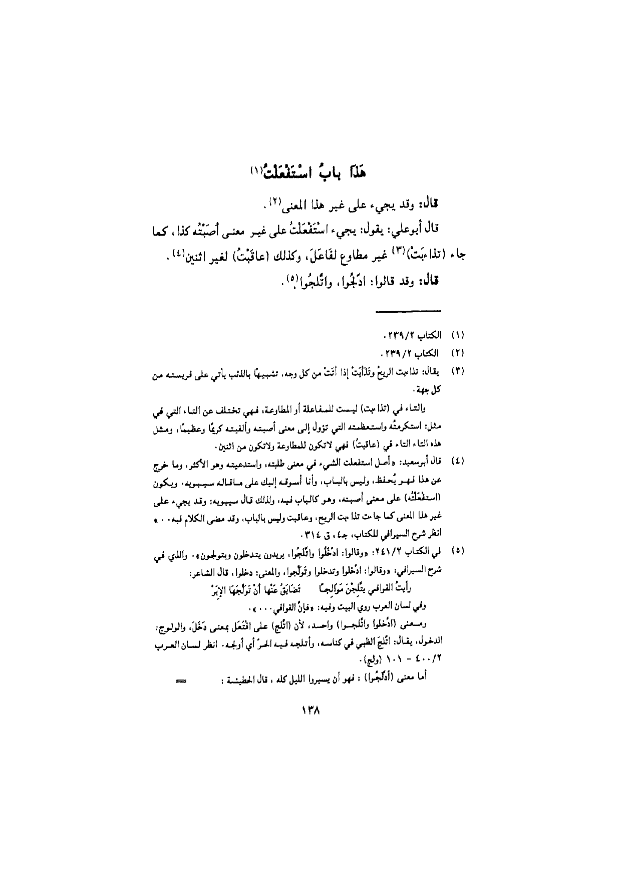 قال أبو علي: يقول: يجيء اسْتَفْعَلْتُ على غير معنى أصَبْتُه كذا، كما جاء (تَذاءَبت) غير مطاوع لفاعَلَ، وكذلك (عَاقَبْتُ) لغير اثنين.