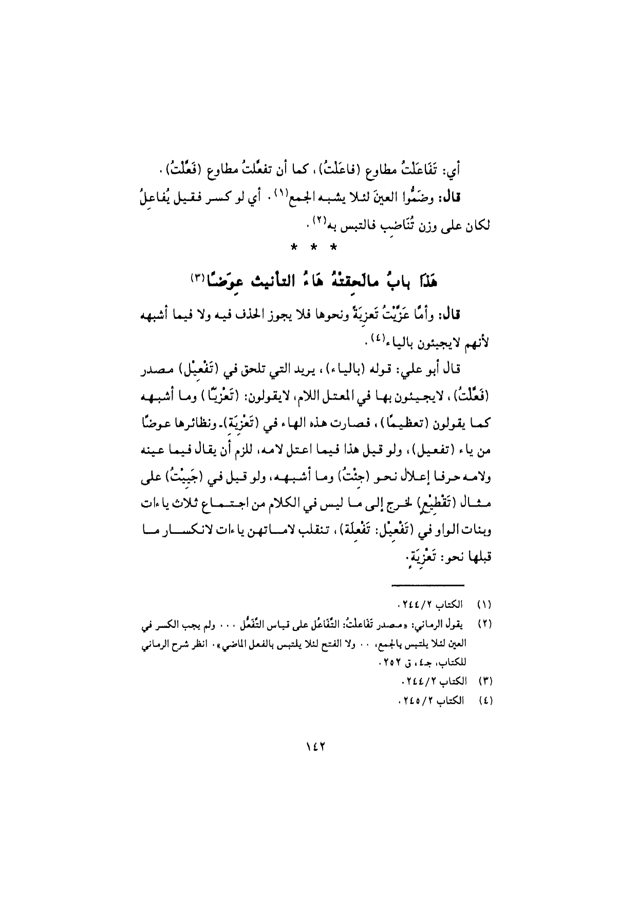 قال أبو علي: قوله (بالياء)، يريد التي تلحق في (تَفْعِيل) مصدر (فَعَّلْتُ)، لا يجيئون بها في المعتل اللام، لا يقولون (تَعْزيًا) وما أشبهه كما يقولون (تعظيمًا)، فصارت هذه الهاء في (تَعْزِيَة) ونظائرها عوضًا من ياء (تفعيل)، ولو قيل هذا فيما اعتل لامه، للزم أن يقال فيما عينه ولامه حرفا إعلال نحو (جِئْتُ) وما أشبهه، ولو قيل في (جَيِيتُ) على مثال (تَقْطِيْعٍ) لخرج إلى ما ليس في الكلام من اجتماع ثلاث ياءات وبنات الواو في (تَفْعِيل: تَفْعِلَة)، تنقلب لاماتهن ياءات لانكسار ما قبلها نحو: تَعْزِيَةٍ.