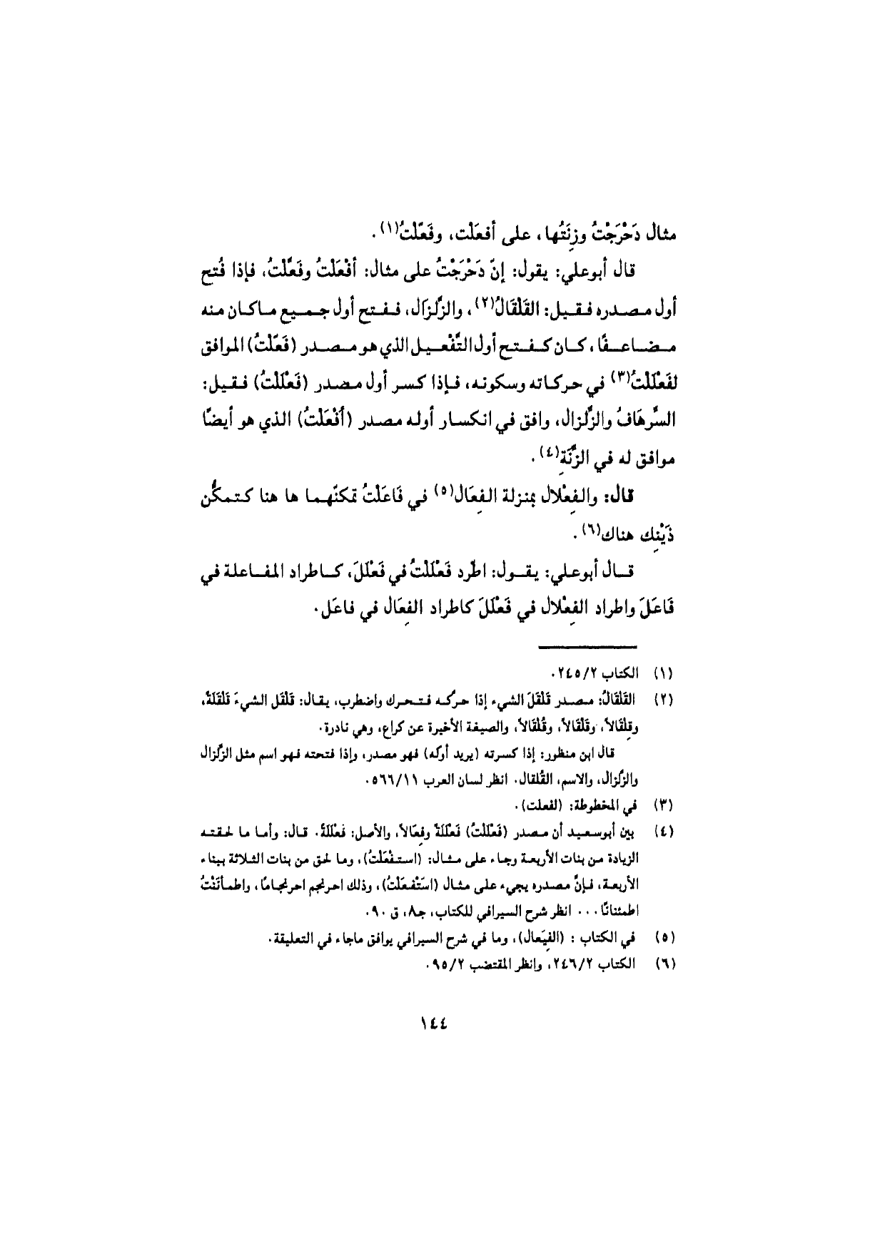 قال أبو علي: يقول: إنّ دَحْرَجْتُ على مثال: أفْعَلْتُ وفَعَّلْتُ، فإذا فُتِح أول مصدره فقيل: القَلْقالُ، والزِّلزال، ففتح أول جميع ما كان منه مضاعفًا، كان كفتح أول التَّفْعيل الذي هو مصدر (فَعَّلْتُ) الموافق لفَعْلَلْتُ في حركاته وسكونه، فإذا كسر أول مصدر (فَعْلَلْتُ) فقيل: السِّرهافُ والزِّلزال، وافق في انكسار أوله مصدر (أفْعَلْتُ) الذي هو أيضًا موافق له في الزِّنَةِ.