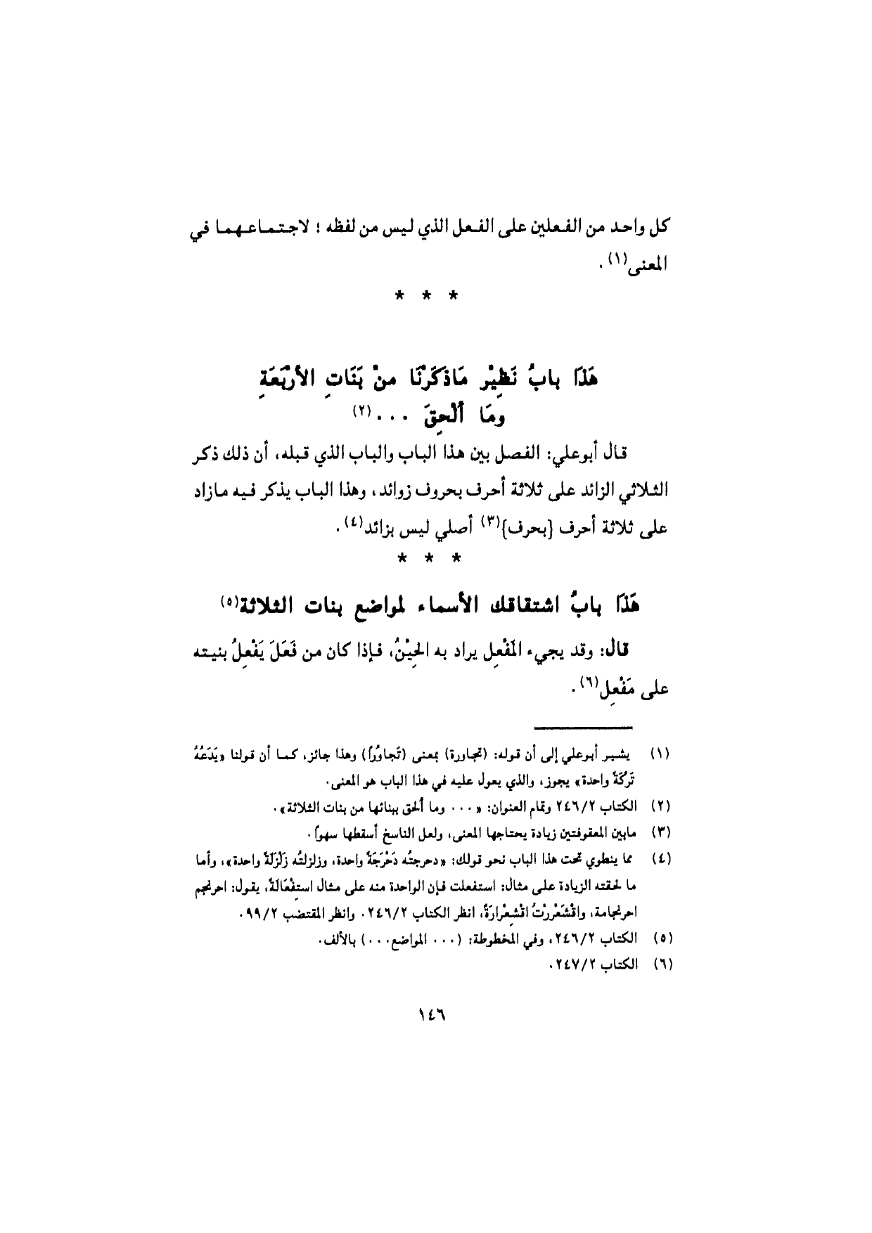 قال أبو علي: الفصل بين هذا الباب والباب الذي قبله، أن ذلك ذكر الثلاثي الزائد على ثلاثة أحرف بحروف زوائد، وهذا الباب يذكر فيه ما زاد على ثلاثة أحرف {بحرف} أصلي ليس بزائد.