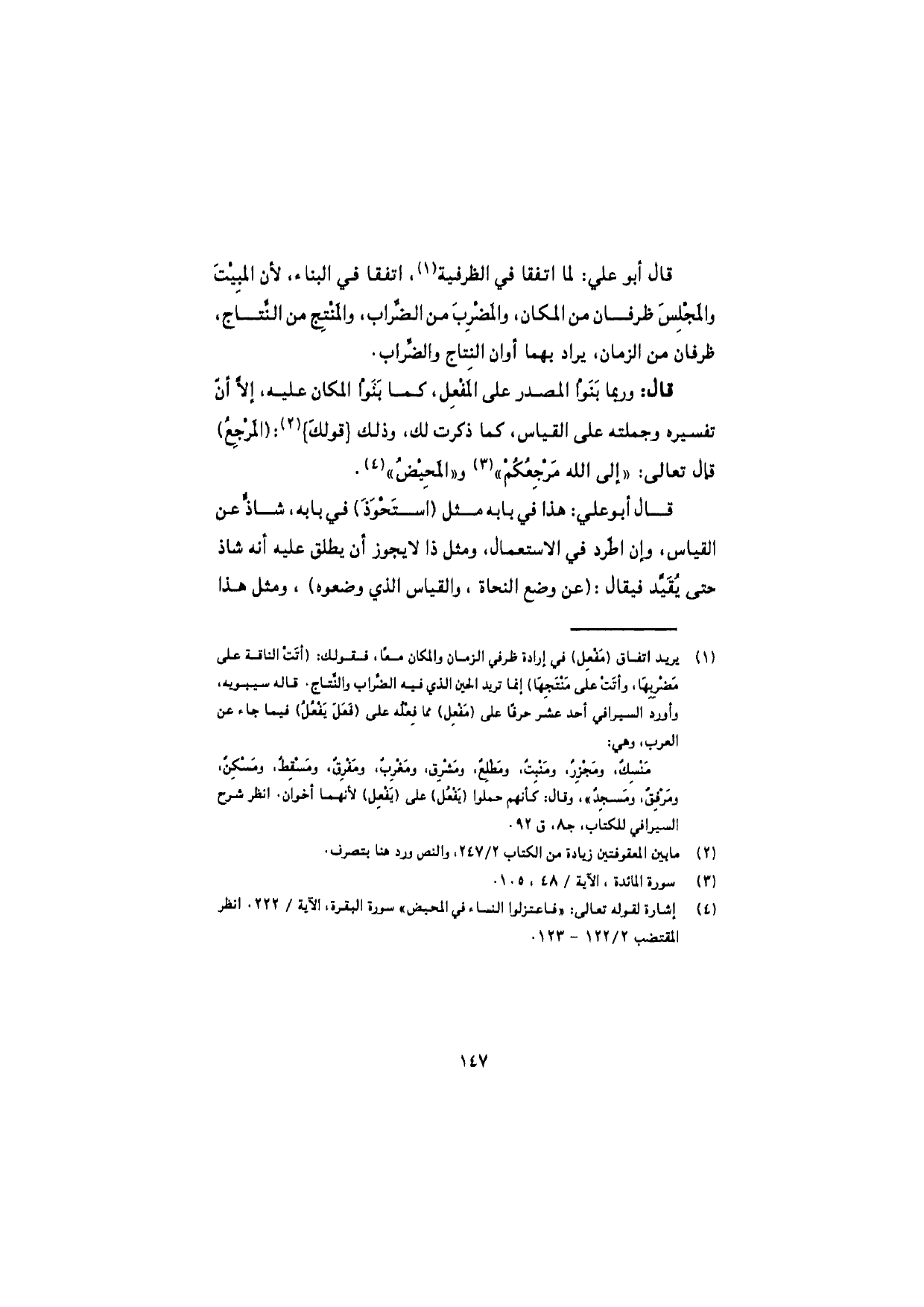 قال: وربما بَنَوا المصدر على المَفْعِل، كما بَنَوا المكان عليه، إلاّ أنّ تفسيره وجملته على القياس، كما ذكرت لك، وذلك {قولك}: (المَرْجِعُ) قال تعالى: "إلى الله مَرْجِعُكُم" و "المَحِيضُ".