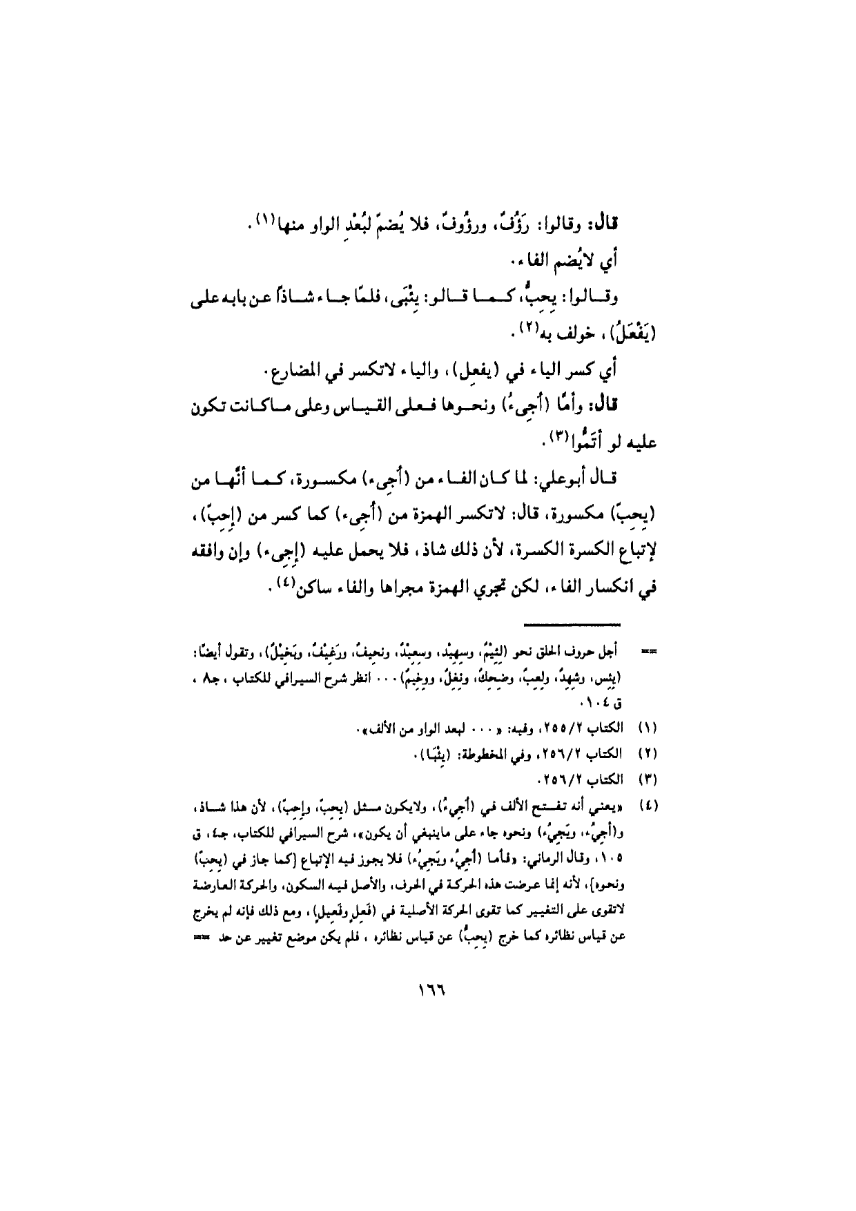 قال: وأمّا (أجِيءُ) ونحوها فعلى القياس وعلى ما كانت تكون عليه لو أتَمُّوا.