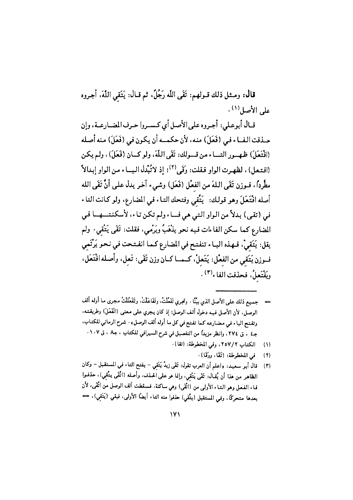 قال: ومثل ذلك قولهم: تَقَى الله رجلٌ، ثم قال: يَتقي اللهَ، أجروه على الأصل.