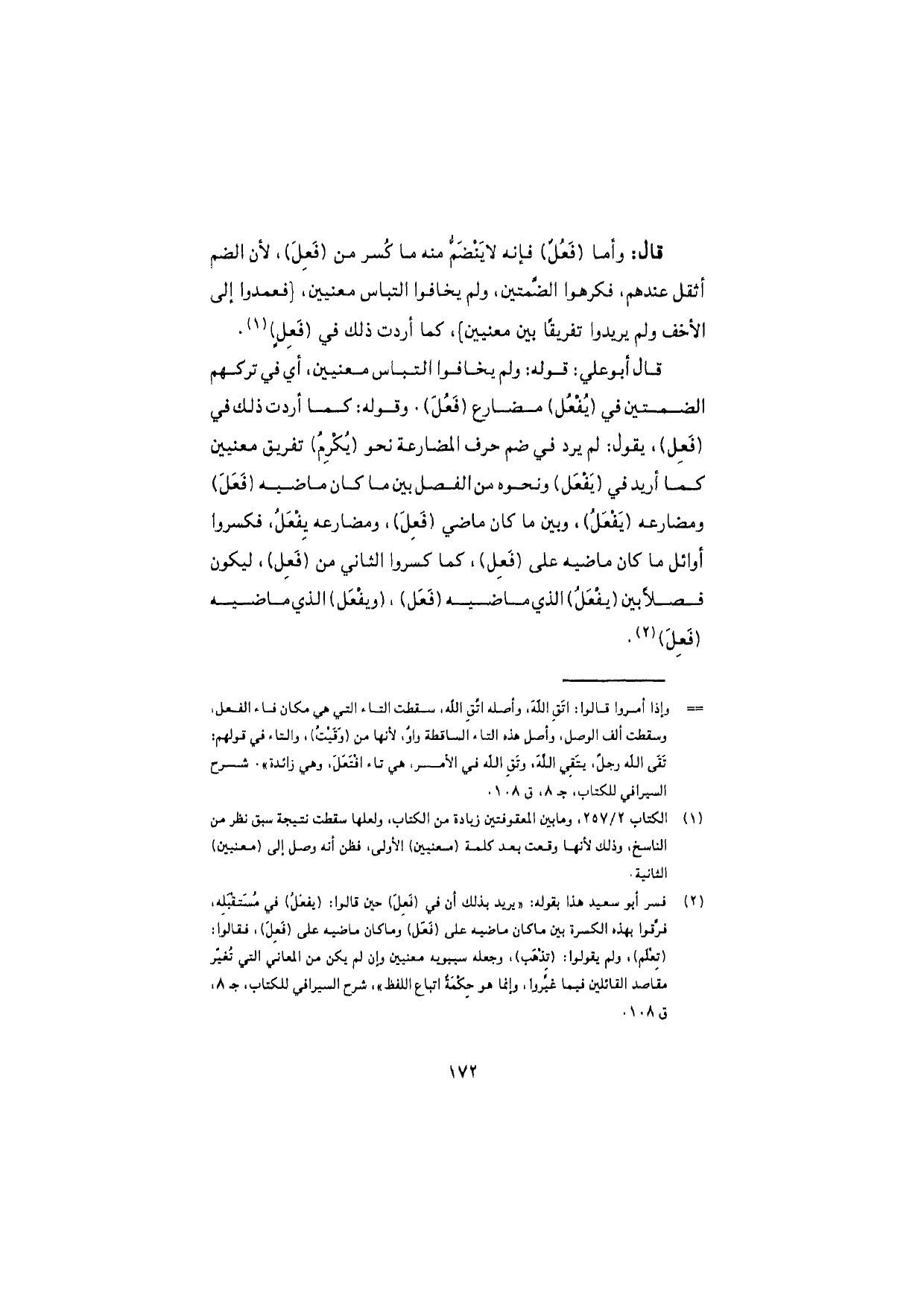 قال: وأما (فَعُلٌ) فإن لا ينضمُّ منه ما كُسِر من (فَعِلَ)، لأن الضم أثقل عندهم، فكرهوا الضمتين، ولم يخافوا التباس معنيين، {فعمدوا إلى الأخف ولم يريدوا تفريقًا بين معنين}، كما أردت ذلك في (فَعِلٍ).