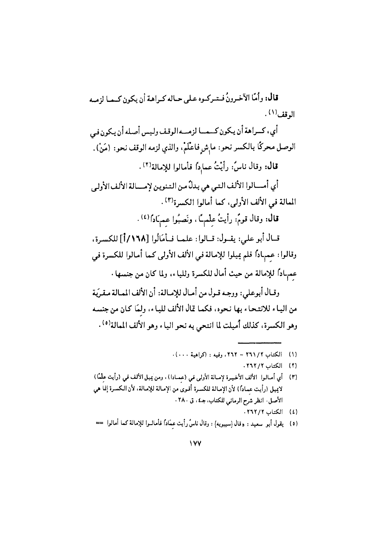 قال أبو علي: يقول: قالوا: علما فأمالوا [168/أ] للكسرة، وقالوا: عِمادًا فلم يميلوا للإمالة في الألف الأولى كما أمالوا للكسرة في عِمادًا للإمالة من حيث أمال للكسرة وللياء، ولما كان من جنسها.