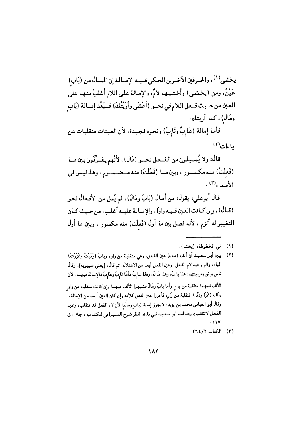يخشى، والحرفين الآخرين المحكي فيه الإمالة إن الممال من (بابٍ) عَيْنٌ، ومن (يخشى) وأختيها لامٌ، والإمالة على اللام أغلبُ منها على العين من حيث فعل اللام في نحو (أعْشَى وأرَيْتُكَ) فبَعُد إمالة (بابٍ ومالٍ)، كما أريتك.