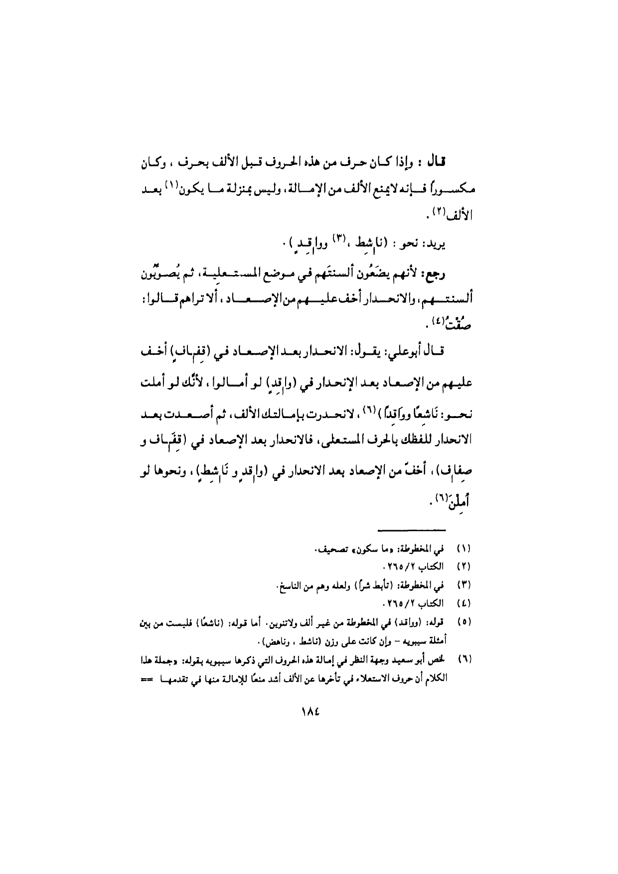قال أبو علي: يقول: الانحدار بعد الإصعاد في (قِفافٍ) أخف عليهم من الإصعاد بعد الانحدار في (واقِدٍ) لو أمالوا، لأنّك لو أملت نحو: ناشِعًا وواقِدًا، لانحدرت بإمالتك الألف، ثم أصعدت بعد الانحدار للفظك بالحرف المستعلي، فالانحدار بعد الإصعاد في (قِفاف وصِفاف)، أخفّ من الإصعاد بعد الانحدار في (واقِدٍ وناشِطٍ)، ونحوها لو أمِلْنَ.